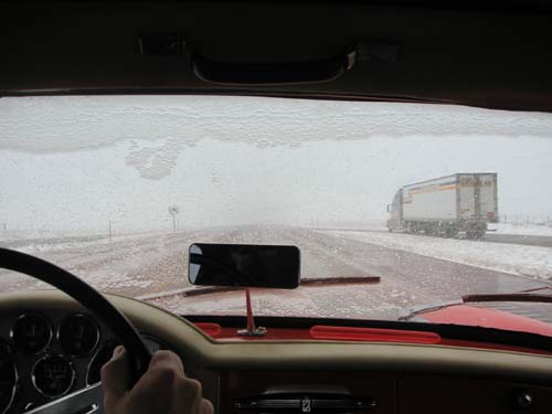 As we approached Laramie, the snow seemed to stop and the roads dried up, so we decided to press on another 50 miles to Cheyenne. Big mistake, since we didn't realize that the road went up over an 8500-foot pass, and we were back in the snow storm again. We finally pulled into Cheyenne, climbed out, and looked over our steed, which was totally ice-encrusted. Sorry, Glenn — I'll take good care of her when we get home!