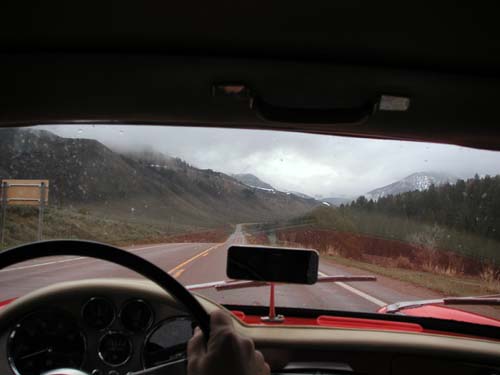 Porca madonna! The white and purple part is exactly where we were and intended to go today. We made some inquiries regarding road passability, and decided that we needed to change our planned itinerary. We had hoped to go up past the Grand Tetons (which we jokingly thought meant Big Hooters, and later found out that that's exactly what it does mean) and then across the center of the state on secondary roads. But that route would have taken us up over a 9500-foot pass, so we opted for a more southerly one. We headed southeastward out of the Hole, and quickly the snow dried up and we were treated to some fine driving on some beautiful, empty, twisty roads. We were feeling quite smug with our decision.