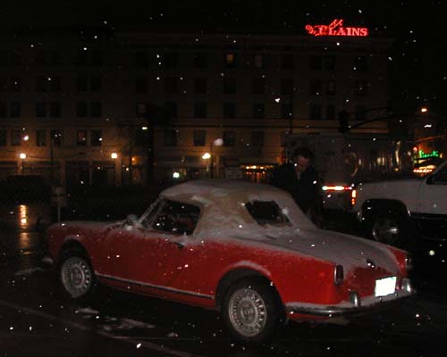 Alas, when we emerged from dinner downtown tonight, we found our ride coated in yet more snow (see below). As we were pulling out of the parking lot, we passed by a group of people, from which we heard a female voice say, "It's a Studebaker, isn't it?". We couldn't stop laughing all the way back to the hotel...