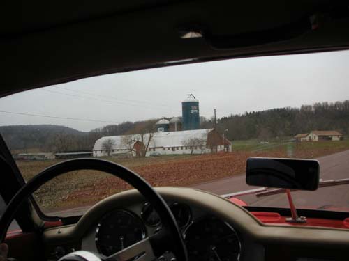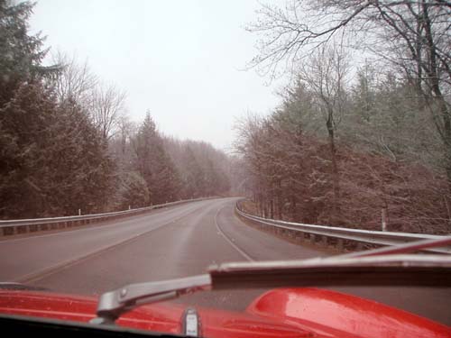 Today, as we awoke in Warren, Pennsylvania, we rolled over, rubbed our eyes, looked out the window, and saw ... rain and fog, as far as the eye could see. The same as yesterday. Except that we also saw some cars going by with snow on their roofs. But we had places to go and things to see, so we loaded up the Giulietta and headed yet further eastward, like lemmings to the sea. Our route took us up into the Allegheny Mountains, and (naturally) we ran into the snow ourselves, although it wasn't all too treacherous: