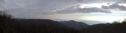 Tuesday, January 6 Having spent the night in Lexington (VA, not KY), we awoke to blue skies, and so shunned the Interstate in favor of the Blue Ridge Parkway. What a fantastic sports car road—endless twists and turns with the pavement in excellent condition—and we had it all to ourselves! There were many places where we were literally on the ridge, with marvelous views on both sides of us. Here's an example: