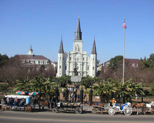 Saturday, January 10 Captain Barb had naval drill this weekend, so we hiked over to the French Quarter, had coffee and beignets at Cafe Du Monde, walked all over the place, and met a fellow art student of Vi's who'd moved to New Orleans for lunch. We're getting a needed dose of barbecued shrimp, spicy boiled crawfish, jambalaya, and all that good stuff. Here's the obligatory tourist shot of Jackson Square: