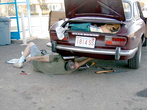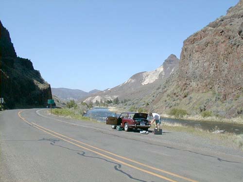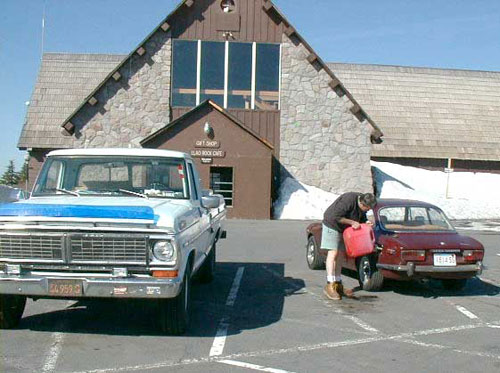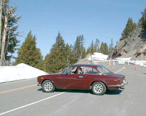 Day 3 - May 11UmmmmOh-Oh. We got off to a great start this morning! We both arose quite early and were on the road at 7AM! Stopped at one of the pervasive Oregon espresso shops for coffee and a muffin, and motored off northeast. Since we'd gotten such a good start, we decided to reward ourselves with a detour to Crater Lake National Park. That was the day's first mistake. Everything is farther apart here than back east, and we figured on picking up gas at the park and continue motoring thru the park and on northward. The increasing snow depth alongside the road should have told us something - turns out that the park was barely open for the season with no gas available and the next closest gas available 45 miles away at the other end of the park. However, the park road wasn't open yet for the season (due to snow), a feature that the park ranger failed to mention when we paid our entrance fee. So, as we are becoming well used to doing, we begged some gas from one of the park workers, enough to make it back out of the park and on our way south before we could continue on north and eastward again. Seems like the theme is becoming "Hi, Mom. Send gas!". Behind schedule now (we had our sights set to get out of OR and into WA for the night), we were zipping along nicely, enjoying sunny, warm, top-down weather buzzing along until about 3:30 - when "You don't smell that, do you?It must be some other truck or something". Nope, it's us. Cruising into the only gas station in downtown Long Creek, OR (pop 240) and looking underneath, it looks like the new Alfa's rear end pinion seal is spraying oil all over, including the muffler (source of the burning oil smell). The mechanic at the OK Garage (its real name!) had gone for the day, but the gas lady allowed us access to his unlocked but limited tools (to augment our limited tools). So here's where we stand: With what we had available and not wanting to do any irreversible damage, we couldn't remove the rear end fill plug to check/fill the oil (they're notoriously hard to get off sometimes without the right tool). So we've decided to wait the night out here in Long Creek, pop 240, for the mechanic (with lift) to help get the plug out and assay where to go from here. All said, this could have happened in much worse surroundings - there's a wonderful little hotel right behind the garage, and across the street there's a gourmet restaurant that serves free Guinness on tap and .. . .. . Dave here. John just wrote that and I think he's delirious. If you really want to get a feel for Long Creek's accommodations, see "Beer" below. This is where
