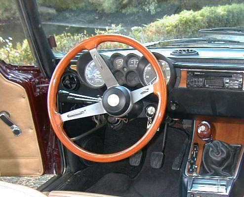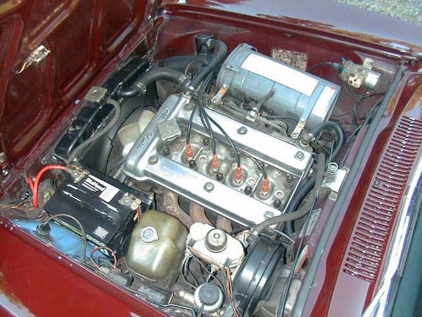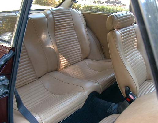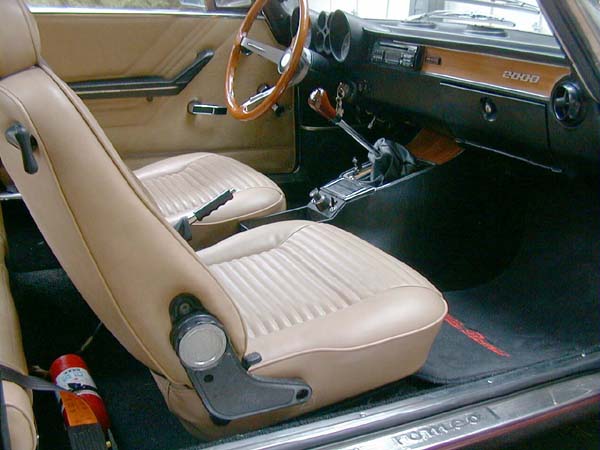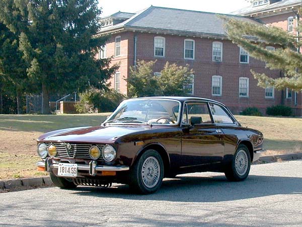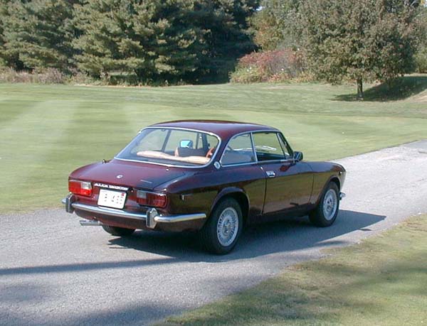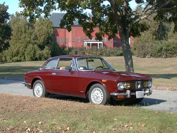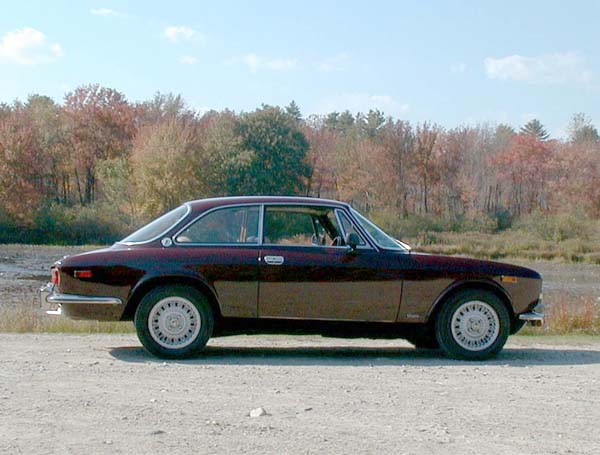1974 Alfa Romeo GTV (burgundy) The Alfa Romeo GTV of the late '60s and early '70s is, in my mind, one of the most appealing body designs ever penned, so elegant in its simplicity, beautiful Italian curves, cute and aggressive at the same time, Bertone's crowning achievement! I keep coming back to them—this is my third one! This car was purchased in May of 2001 from a gent in San Francisco, who in turn had bought her from a Los Angeles Alfa mechanic, whose personal car she was. The mechanic had done a lot of recent work, including rebuilding the engine (with Sperry Stage 4 heads), transmission (she is the smoothest-shifting Alfa I've ever owned—no second-gear problems even when cold—lightened gears?), and suspension (including uprated springs and sway bars). She is also the nicest-handling Alfa I've ever owned (and that's saying a lot). (My brother John and I flew out to San Francisco and drove her back to Boston, taking the scenic route. This very fun trip is fully documented, in that we hauled along a laptop and digital camera, and updated this web site daily with photos and, uh, commentary. You can read about and see our exploits by clicking here.) The San Francisco owner had also had a lot of mechanical work done—$5400 worth—during his stewardship. This included a completely rebuilt driveline (the car is vibration-free); new fuel cut-off solenoid; new Spica microswitch; plugs, points, condenser, rotor, distributor cap; fuel and Spica oil and air filters; valve adjustment; new thermostatic actuator; new fuel pump; new sump guard; new emergency brake shoes and cables; four new Michelin XGT-H4 tires; belts and hoses; and a new Die-Hard battery. Since I've owned the car, the new things that have been added or replaced include: heater fan motor; complete three-point seat belt assemblies; passenger door, rear swing-out window, door handle, and trunk gaskets; all air vent hoses; windshield washer bag; high-output headlamps (with headlamp relays added to preserve the switches); amber fog lamps; Alfa-logo wooden shift knob; door jamb switches; brake and clutch pedal pads; front and rear Alfa logo emblems; Alfa script floor mats; trunk mat; and leather emergency brake boot. The carpets were removed, shampooed, and redyed the original black. The center console was removed and recovered in original black vinyl, and the wood refinished. The tan vinyl interior was in excellent condition, with the exception of a small tear in the driver's seat bottom, so I had both the driver's and passenger's seat bottoms recushioned and reupholstered. The rear parcel shelf was also recovered in black vinyl. In other words, virtually everything on the car is either new or recently serviced or restored. Everything works—even such mundane things as the trunk and engine compartment courtesy lights and foot-operated windshield washer. But the coup de grace is her magnificent new paint! I disassembled her completely (removed all bumpers, grills, lights, door handles, antenna, moldings, windows, etc.) and sent her via flatbed to John Schiavo's shop for a complete makeover. (John also painted my Alfa Montreal and did a marvelous job.) We stripped her down to bare metal, whereupon we found that there had been some slight damage to the rear left quarter panel and rear valance (there was absolutely no rust anywhere). I opted to do it right, and bought new body panels for those areas (yes, you can still buy them!), which John's crew welded in seamlessly. Then the car received an acid bath, primer, sealer, base coat in the original color (Rosso Amaranto), and clear coat. The door jambs and inside hood and trunk lids were also painted. The paint was properly buffed to a high state of luster. She also received a new windshield, since the glass was all out anyway. The paint was done at a cost of $7000—not cheap, but reasonable considering the amount of effort involved. If you'd like to see some before, during, and after photos of the paint process, click here. Anyway, as you can see, she is beautiful. The color is to die for! It's hard to describe, being a burgundy / maroon / plum—a deep, dark red leaning more toward brown than toward blue. Because of the different venues and lighting in the photos above, the color even appears to vary somewhat between the photos. On my monitor, the first photo seems to portray the color quite accurately. When I bought the car, it had Panasport wheels. I like Panasports as aftermarket wheels go, but prefer the understatement and originality of factory-supplied Cromodora Turbinas. They also happen to be very good wheels, lighter even than the Panasports. Since I happened to have an excellent set, I sold the Panasports (which paid for our plane tickets to San Francisco!), and the Cromodoras were sandblasted, painted, the Michelin tires mounted, and installed. There is a Toshiba single-disk CD player/radio, with two 5" round speakers in the footwells and two 6"x9" three-way speakers in the rear parcel shelf. The sound is remarkably good and it plays quite loud without distortion, not that I ever had it on very much. Alfa engines make such sweet music... In the fall of 2001, she paid a month-long visit to Glynn Motorsports, where Alfa guru Paul Glynn administered a final round of mechanical refurbishments (to the tune of $5000). These included: Replaced cracked bellhousing; drilled and retapped block for mounting studs for transmission; new flywheel, rear main seal, pilot bushing in crankshaft; new clutch and clutch slave hose; resurfaced friction plate; flushed clutch hydraulics; disassembled and rebuilt transmission with new synchros and other new parts; new front and rear transmission seals, inner shift boot, differential pinion seal; adjusted torque and preload on differential; new trans and diff fluid. Replaced bad trailing arm; all new trailing arm and trunion bushings; installed Delrin thrust washers at T-bar to limit rear axle movement; replaced left rear wheel studs, wheel be