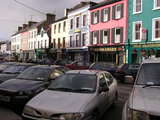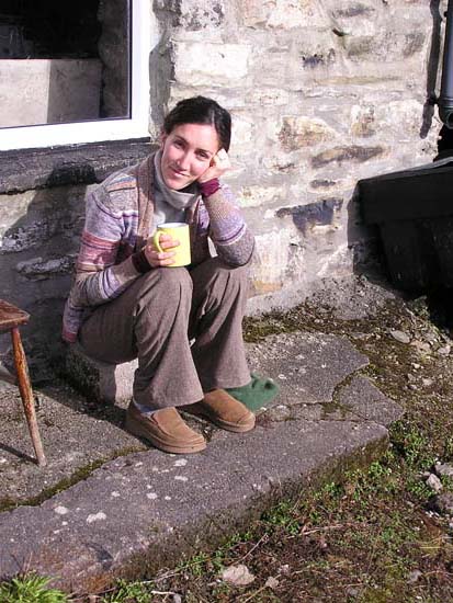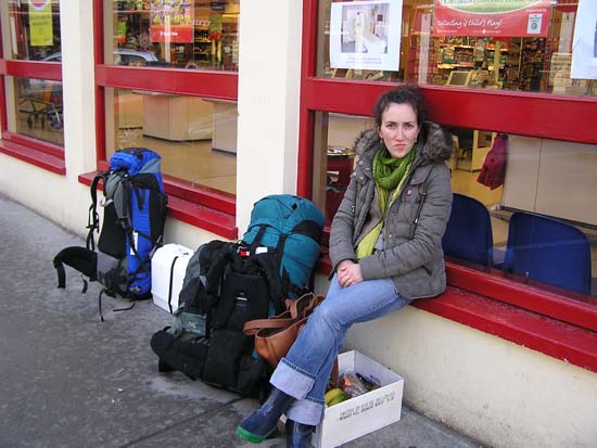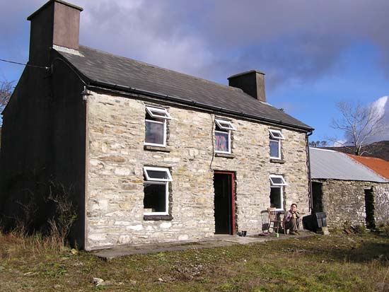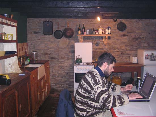above for a larger view, Day 1: February 8, 2006 I’ll spare you the boring stuff (we took off …we landed). Then we arrived at immigration and the first hiccup came along and almost knocked us right back to Boston. Immigration was concerned about the length of time (three months) we told them we would be staying here. They wanted several things: One: proof that we had enough money to live on for the next three months. Two: written permission from Uncle Tommy saying that it was alright for us to stay in his cottage. And three: proof that we had (our parents are going to love this one) health insurance, so if, as they put it, “she wakes up sick in the mornin’ yeh won’t be a burden on the state”. So I figured I would just hop online using the airport wireless network, pull up my bank statement and the first problem would be solved. Well, it was of course three a.m. in Boston and the bank had temporarily shut down their web site for updates and improvements (good old Murphy!). We then told them that Uncle Tom was in the hospital recovering from major surgery and that it probably wouldn’t be a good idea to call him, given the hour. We went on to inform them that in our country, the richest country in the world, health insurance was a privilege available only to the wealthy and those fortunate enough to have jobs that provide it. They were not amused. Luckily, I then happened to find in my wallet a deposit slip from only a few days earlier and the immigration officers surprisingly accepted it a proof of savings. (They shouldn’t have, especially since I no longer have nearly as much money in the bank as the slip says I have). They also, for the time being, were willing to let us into the country with neither the note from Tommy nor the health insurance (we told them we would be on our best Irish Catholic behavior). So into Ireland we stepped, and then right onto a bus. The bus ride took us on a nice meandering tour from Shannon to Cork City, then from Cork City to Bantry Town. In Bantry we made a quick stop at the local grocery store (pasta and beer) before calling a cab to take us out to Rose Cottage in the Mealegh valley. Upon his arrival, the cab driver gave us a blank stare and then said something that, although comprehension was nearly impossible, I think roughly translated to, “you two American kids are gonna have to give me more than that to work with”. So there was talk of the old school house nearby and the 5000-year-old standing stones in the yard. He said he might know the place and we were off. About 25 blind turns on a nice one-lane road later, we arrived at Rose Cottage. At this point, Jessamy and I had slept about 2 or 3 hours in the last 24 and, although we were excited about our new accommodations, all we really wanted to do was eat and sleep. The caretaker and keeper of the keys, however, was nowhere to be found (through no fault of his own, I might add; he thought we were getting here a day later). So after trying to break in for a while (who would have thought folks still used skeleton keys?), Mr. John Cottor pulled in to his home next store and Jessamy and I breathed a sigh of relief.