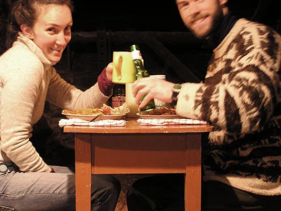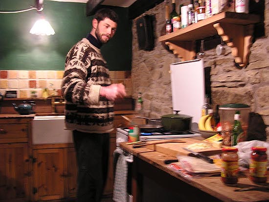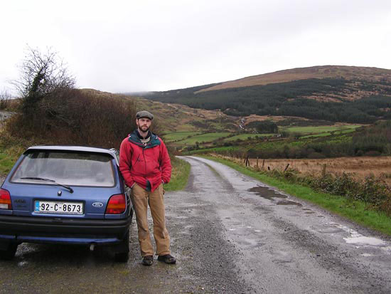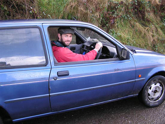 above for a larger view, February 16, 2006 So we traveled all the way across the Atlantic, exchanged our US currency for Euros, accepted the fact that they are going to continue to drive on the wrong side of the road despite the fact that the rest of the non-UK world mostly drives on the right, and are even willing to believe that one-lane roads are plenty wide to accommodate two cars traveling in opposite directions. And yet despite all of these attempts to assimilate into European culture, today we went out and bought a good old-fashioned American-made Ford. It is quite small, mind you: a little 1.1 liter, 4-speed manual (of course), 3-door hatchback Fiesta. The price was right, however, at 600 Euros and most importantly it has a 9.5-gallon petrol tank that—get this—only cost 35 Euros (that’s about 45 dollars) to fill up. And you thought gas prices were high in the US! But after all that we are now mobile. We sealed the deal with a very nice but impossible-to-understand gentleman (who, while describing the attributes of the car, shamelessly and continuously spewed crumbs from his mouth) and we were off. Jessamy and I took a 20-mile drive in our new little car around the valley that we live in. It is a beautiful drive with farms and open fields around every bend. Of course, there may also be another car around every bend, and so one must be ready to ditch the car off the side of the road at a moment’s notice. They also, upon passing one another, give a little (fore) finger wave as if to say, “I’m glad you didn’t hit me and if we ever meet again let’s not run into each other then either”. I’m sure I’ll get the hang of it after a while, but for now I drive a bit slower than the other drivers would like. The weather has been more of the same: twenty minutes of sunshine followed by heavy rain and even heavier wind. If it rains hard enough, the water is driven in under the door (and down the chimney), but I have to admit that it just adds to the allure of this old stone cottage. Jessamy and I are adjusting to the indoor climate as well, and evenings are not spent quite in the fireplace anymore but instead just slightly outside the reach of the flames. We have also begun a bit of a discussion with our neighbors as to what is best to burn, i.e. peat, coal, or wood. They both agree that coal puts off the best heat, and if that is the case then I must be doing it wrong. I can get a good coal fire going now without too much trouble, but when you go to warm your hands by it you find that you have to practically stick them right in before you feel any warmth. A couple of mornings back, we woke up and went to make our morning tea only to find that, when I turned the faucet, instead of the typical deluge of water I didn’t even get a drip. After a lengthy investigation, I found that the culprit was a small stone that had lodged itself in the intake valve and, as a result, allowed all of the water to drain out of the system and back into the river. Now the line that feeds the pump is about 150 feet of 1-¼” inside diameter hose (or, as some of you may remember, the horse that needs to be buried that Jess is so sad about). Priming that much hose using nothing more than a teapot was a really big … let’s just say that it took me all day to get the water running again.