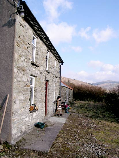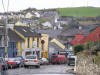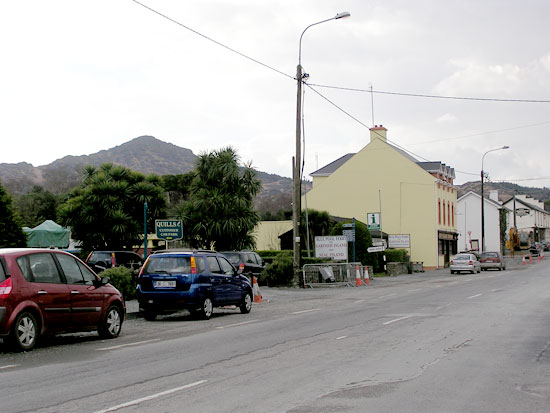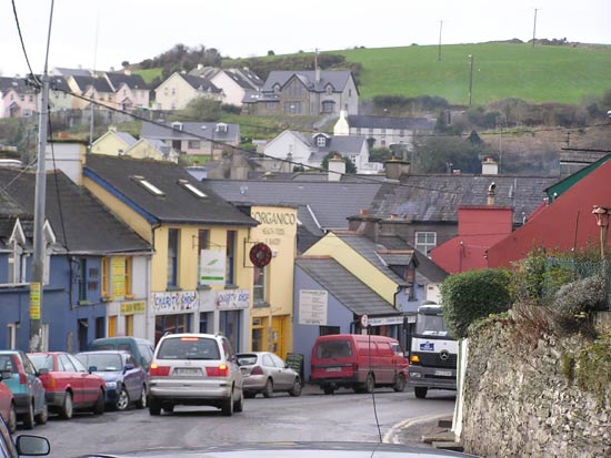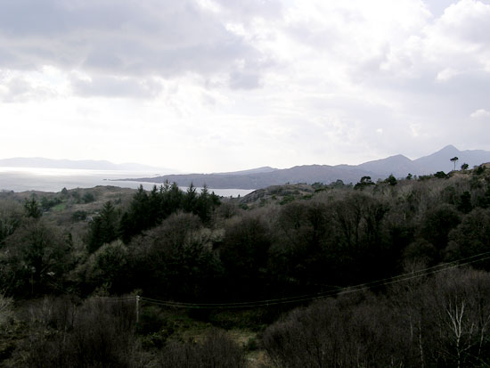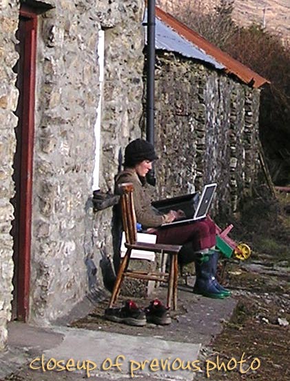 above for a larger view, February 20, 2006 We are sitting here outside on the sunniest day we have seen yet. Spring has begun in Ireland, and this is a shock to our systems, so accustomed as we are to the eight-month winters of Vermont (though it sounds like winter in VT sucks right now—sorry). Yesterday, we went for a walk and saw tulips beginning to bud, and the yard is filling up with small purple flowers—those little signs of spring that come up around June back home. So Bobby and I spent the morning clearing up the yard, moving piles of brush and cleaning lilies that have needed such treatment for the past five years. There are lilies (I think that’s what they are, anyway: daylilies) everywhere, growing out of the old stone wall separating our yard from the road and in little patches all over the lawn. Bobby also spent the morning burying part of the horse. So now that the sun is shining and we have our little car, we are ready to commence roaming these hills, but starting out slowly just to make sure that the little thing can handle it. Yesterday, we went to Glengariff, which is 17 kilometers up the coast, and a little town of not much consequence (tho I did buy a hat, and it’s lovely). The town actually looks like something of the old west, with its rows of old buildings backed by great, craggy, dusty mountains. There are palm trees too, and you actually see them nearly everywhere. It’s so strange that this chilly little country seems in many ways tropical. It’s as if Wyoming, Vermont and Costa Rica all chipped in design plans. Anyway, yesterday’s excursion went well, tho it almost seems like they just forgot 5th gear, as she does not like to go even close to fast. Speaking of which, the speed limit on our road—our tiny, windy, hilly and narrow road—is 80 kilometers per hour. That’s 50 miles per hour! It is insane, truly, and we seem to be the only ones who think so, as it is common for others to pass right by, even those who have a big L plastered on the back, a sign that they are still new drivers. Yikes! We have yet to spend an evening in town, tho we do spend many days there. The internet café where we spend the most time is a little place called Organico, and it reminds us both very much of VT, and specifically Stone Soup (you can see the place in one of the photos). Hopefully, as we become more certain of the integrity of the car, we will check out the pubs, meet some folks, and have some interesting discussions. I am very ignorant about the politics of this country and would like to learn more, but the newspapers seem to focus more on global issues and TV stars than anything local. Certainly, tho, the political situation here, exclusive of the obvious situation in Northern Ireland, is entirely different from that over in the States. Indeed, this is one of the most beautiful things about this place. The tension and animosity coming from all sides in the US, so thick you feel like you can’t see through it sometimes, simply does not exist here. There is anger, to be sure, but it’s not always on the tips of their tongues. If you ask, tho, they will unapologetically tell you that Bush is not only an obvious and shameless moron, but also, in the words of neighbor Tim, “a real dickhead, like”. Here, they hear about the casualties in Iraq regardless of who the dead are; to these people, civilians’ lives count just as much as American soldiers’. Imagine! Yes, it is another world over here, and it is one where I could stay forever. Ah, but if it weren’t for you folks back home…and my dog…