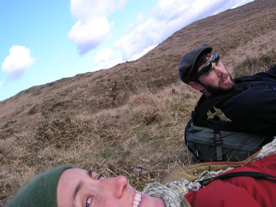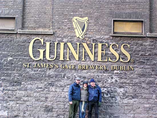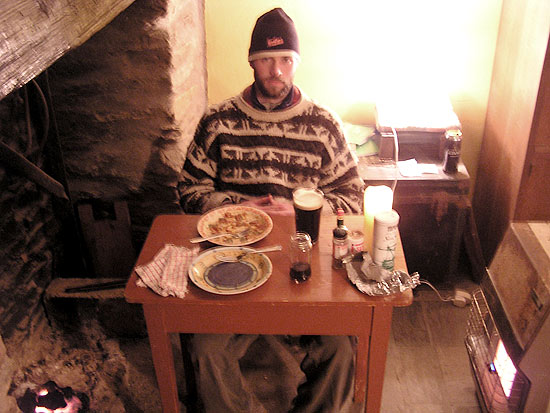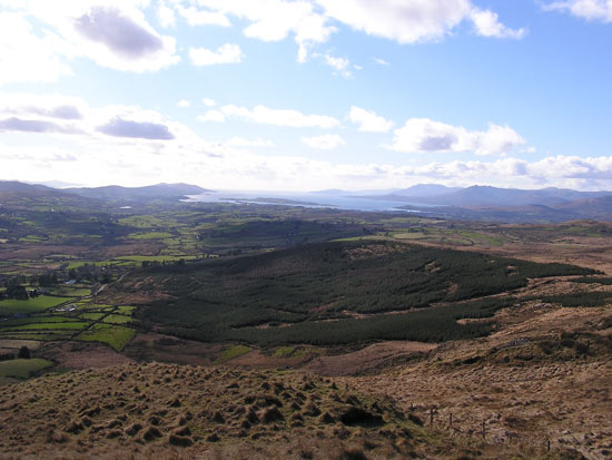 above for a larger view, March 6, 2006 The last time Bobby wrote, we were experiencing a freak cold snap that was due to last a few days. Ten days later, we are breaking records for the longest and coldest stretch in recent history. What luck! We have awoken the past couple of mornings to frozen pipes, and so there’s no water till it warms up, which is usually right before dark. However, the cold days have meant brilliant sunshine, and who can really argue with that? This week, we took a trip up to Dublin to visit our friend Malcolm. I met Malcolm while I was working Wednesday night Irish Sessions at the Radiobean, so it’s really no coincidence that we are both here now. He is a physics professor and is here on sabbatical, supposedly to work on his curriculum and to restructure his approach to teaching. But the “trad” music that brought him here seems to occupy most of his time, and why not? In Dublin especially, there are sessions in nearly every pub and on nearly every night, and Malcolm seems to know ‘most everyone in the scene. We ended up one night in the Palace Bar (famous former haunt of such writers as Flann O’Brien and W.B. Yeats) and someone just handed Malcolm a fiddle and sat down to chat with Bobby and me while Malcolm took his spot amongst the musicians. (During our chat, it came up that the Irish government takes about 20% out of paychecks, which is less than many Americans find gone every week. Unbelievably, the Irish waste these valuable tax dollars on education [free all the way through university] and universal health care. What they don’t have, tho, is an imperialist military bent on taking over the world, but I say that’s their loss). Anyway, Bobby and I, being country folk, found Dublin to be a bit overwhelming. It’s truly huge, larger than Boston but not nearly as diverse. It feels somehow ambiguous; aside from the fact that it was teeming with “traditional” Irish pubs (many of which are actually modern tourist traps), we felt like we could have been almost anywhere in the white-bred world. But Malcolm knows his way around the city (and the pubs), and we had a great time. We spent most of it just walking around, talking and eating a lot and enjoying numerous pints. We eventually found ourselves close enough to the Guinness brewery that we had no choice but to check it out. We had heard that the cost of the tour included a pint and considered it our duty as tourists to find out the truth. The 15 Euro entrance fee nearly scared us away (I mean, that is four pints right there), but Malcolm happened to have a friend working there that day and she cut us a deal. It turned out to be a self-guided tour through six floors of displays, diagrams and television sets, but we thought it to be pretty interesting. And then, sure enough, the seventh floor was a circular room with glass walls and a bar in the middle. So we enjoyed our “free” pints while gazing across miles of Dublin sprawl. It was quite a view, and the Guinness really was the best we’d had. After all was said and done, we ended up back at our hostel, where “this is the worst hostel in Europe” was written on almost every available wall. Maybe it was. The toilets didn’t flush and the showers are not suitable for anyone who has less than two strong arms. But it was cheap, and right next to the bus station. We took the bus there so we wouldn’t have to worry about parking, etc., and we are planning on making the long drive up to Donegal at the end of this week. Didn’t want to overdo little old Ma Ford. She’s our lifeline. Today, we went for a drive up over the mountain pass to the east of our house. Eventually, we ended up in Gougane Barra Forest Park, a beautiful place where wild goats and sheep roam freely in the hills and still manage to poop on every square inch of the trails. On the way back, we saw a sign that said “Walking Loop” with an arrow, and because it was a beautiful day we followed it. We walked for a ways, winding through pastures of grazing cows and crumbling ruins, wondering when it would start to loop back around. When eventually it started raining we turned back, and once back at the car we looked in our guide book and discovered that it was a 196km loop around the Beara Peninsula. Maybe tomorrow.