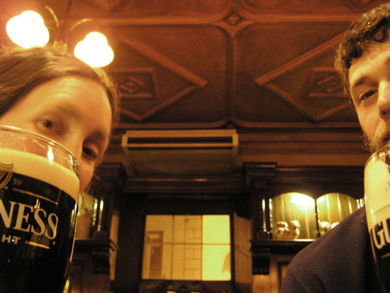 above for a larger view, March 13, 2006 So we are now five days into our Irish road trip, having come up the coast through Counties Kerry, Clare, and Galway. We spent the first night in Ennis, Co. Clare, taking in some great trad music and beer. We left the next morning with the intention of spending the night in Galway, but ended up in tiny Westport on the coast of County Mayo. We have been here now for four days. It is a really beautiful little town, one of the first planned towns in Ireland and, according to Lonely Planet, Co. Mayo’s “tourism honey pot”. But you’d never know it, and therein lies the beauty of traveling during the off season. There are always beds available in the hostels and the pubs are full (really full) of Irish folks, as opposed to tourists like us. Why have we spent so long here in the honey pot, you ask? Well, we were heading out of town on Saturday morning, having slept Friday night at a great hostel in a converted old mill. We were all bundled in to our little Ford and excited about the prospect of spending the day traveling up the coast toward Sligo. With two chatty Swiss Christians tucked snugly in the back seat (what’s a road trip without Swiss Christians?) and rain pounding hard on the windshield, we almost didn’t notice when our muffler fell off ten miles into the journey. It pretty quickly became horribly and deafeningly apparent, tho, as any of you who have lost a muffler will surely know. So Bobby tied the thing back on using our camera strap and we headed back to Westport. Having just passed several garages, we were optimistic about getting the thing fixed and continuing on. But two garages later, Toby from the back seat started praying out loud. Bobby swears this is true, and although Toby had indeed asked permission to pray, he would have had to have been literally screaming to be heard above the roar coming from under our car. As it turned out, there was simply too much noise for even God to hear Toby’s request for a new muffler that rainy Saturday, and we put those kids on a bus and settled in to our new life in Westport. We love it here. The hostel is full of whacks of the international variety. There is Juan, a Spanish man with an affected Mick Jagger air and the worst looking black eye I have ever seen; the eyeball itself is swollen and liquidy, and bright red with blood. When I asked him what happened, he said “Animal!” and pantomimed what I interpreted as being run into full force by a rhinoceros. But I also heard a rumor that he was involved in a knife fight in Galway. He’s coming to the pub with us tonight. We spent last night at the pub with Tom, an Italian who only last week decided to spend six months in Ireland and is now working at the hostel; and Brendan, a chubby, middle-aged, red-faced Irishman who speaks fast and drinks even faster. He’s here on holiday from Dublin, taking part in his own private, annual ritual of spending a week here at the hostel and attempting to drink enough Guinness to fill Croagh Patrick, a feat in which I have nothing but confidence. But Bobby and I, being such productive folks and the total antithesis of Brendan, decided that since we are stuck here we may as well work. There happened to be sign posted in the hostel that a man named Ed was looking for someone to split firewood and plant trees. Who better for this job than us? That’s what we thought this morning. Now we are hobbling painfully around the hostel, having spent the better part of the day splitting wood into tooth-pick sized morsels (per Ed’s orders) and naturally in the pouring rain. On the bright side, Ed and his wife Eriko are two of the most wonderful people I have ever met—organic farmers, musicians, teachers and true kindred spirits; our paths will surely cross again. And tonight Bobby and I feel that we have no choice but to nurse our wounds with (what else?) a pint or two. Anyway, we’ve got to find out the truth about the rhinoceros.