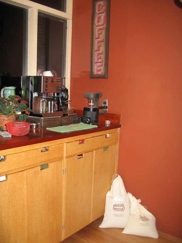 Here's my "coffee station", with roaster (right), grinder (center), and espresso machine