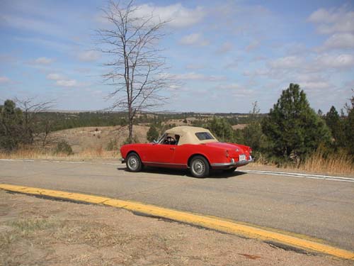 Here's the Giulietta in front of the Nebraska State Forest. Honestly, this is the Nebraska State Forest - it even has a lookout tower. We were there! Honest. You say it doesn't look like much of a forest? Same here.