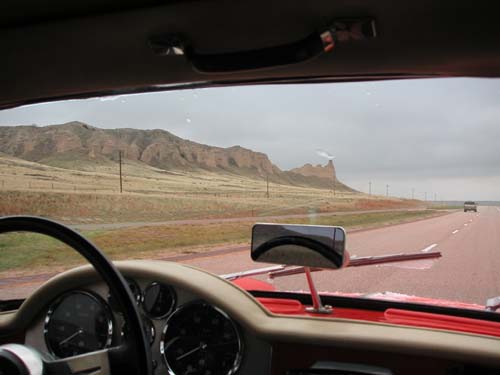 As were driving easterly on Nebraska Route 88, we passed a couple of picturesque geological formations, called Courthouse Rock and Jailhouse Rock. Below is John's view. Note the ice still on the window and the fact that my coat's still on, despite the mighty efforts of the Giulietta's heater (and the sun!).