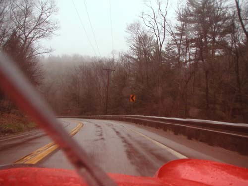 The route we chose was a road that ran northeastward right along the banks of the Allegheny. It would have been a magnificent drive were it not for the rotten, miserable weather conditions. Driving was a balancing act that involved steering with one hand, shifting with the other, and toweling off the inside of the car with ... a third hand, it seemed.