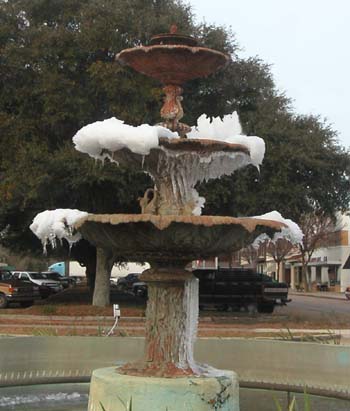 I know it's gonna be tough for you folks up in the arctic northeast reading this to feel sorry for us, but we woke up in Eufaula, Alabama to some pretty frigid temps of our own. Here's what we saw while driving out of town—I'm sure this fountain doesn't freeze very often: