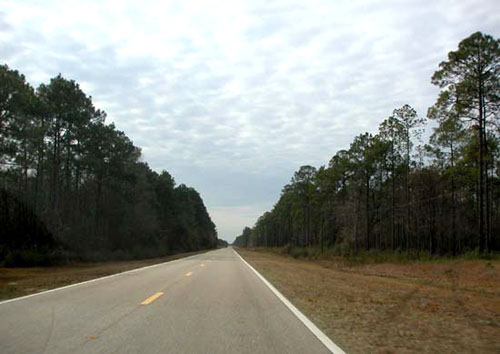From there we motored south into Florida, down a road that looked exactly like this for nearly 100 miles (this is where lots of our beloved plywood comes from):