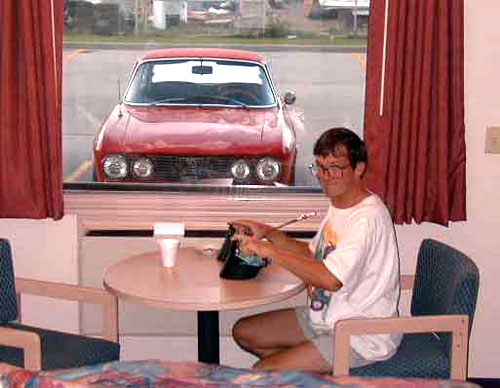 Here's John doing the Alfa morning ritual - check the oil, wash the windshield,