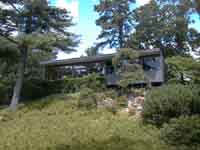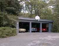 is below and to the right of the house. It holds four cars and my workshop. Dave's two Alfas are visible plus Vi's Subaru. The Bimmer is in front of the red