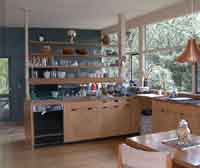 T-shaped, with the bedrooms, baths, office, and studio in the wing out the