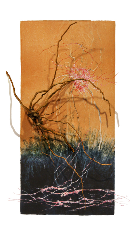 When Roots Resonate @ Bromfield Gallery Text by Maryam Keramaty – Vivian Pratt seems to be saying something about decay, aging, and death. But she doesn’t linger there long, before emerging with an object glowing with life and beauty. At the age of forty, Pratt rediscovered herself, with art, after burnout working in the technology field. This is not unlike what she does with her art materials, dead plants, that she works with and manipulates until they seem to come back to life. Pratt hikes and collects dead plants from beaches, her sprawling backyard, vegetable and flower garden, and local conservation land near her Dedham home. She relates to the human aging process when she works with the dried branches, roots, flowers, and other natural materials. Often, she sees the human body in her materials; a gnarl, bump, or turn in a tree branch that looks like an elbow. In fact, when she has looked at plants under a microscope, she says, “the image stops feeling like plant material an starts feeling like inside a body.” “In general, I don’t start with a concept or idea. I get involved in the process and see when something resonates.” (the title of her show, When Roots Resonate) In one piece, she started with homemade paper and then blended in plant material. She applied a thin layer of paper over that. The effect is you see plant material popping out from the translucent paper. Speaking to that moment when things feel right to her, she says, “I don’t always have words as to why or how this happens.” She doesn’t point to any art influences in her younger years. Pratt remembers the grumpy art teacher, and the C- she received on an art project as a child. In fact, it wasn’t until after she earned her Bachelors in mathematics, her Masters in business, and experienced burnout from programming, that art emerged as an option. A few night classes in drawing and painting and she was on her way. She studied at the Massachusetts College of Art and the School of the Museum of Fine Arts, and has exhibited nationally since 1992. Vivian Pratt wants to tell people what she’s doing and how she’s doing it. Her unique blog tells more about her creative journey. GET THERE: Take the red line to
