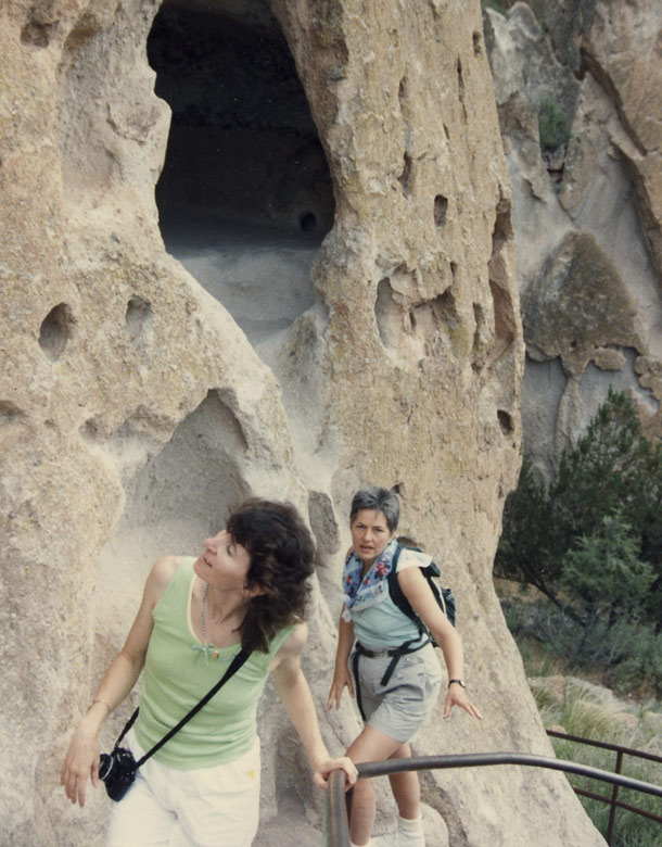 A week was over too soon and we headed back to Albuquerque to drop Vicki at the train station. Mary and I had the afternoon so decided to take the tram to the top of Sandia peak, 3000 feet above the city. In 1988 when Saucy and I took the same tram, we arrived at the top in a hailstorm. They didn’t restart the tram all night and we finally were returned to Albuquerque by bus at about midnight. The picture of Saucy is at the top, all bundled up with some other stranded tourists. Mary and I had a much less eventful stay, although we did see a hang glider take off the cliff.