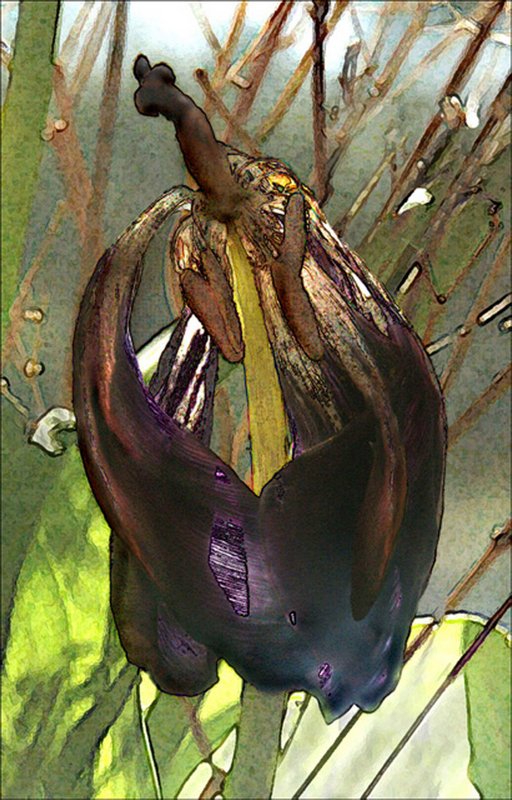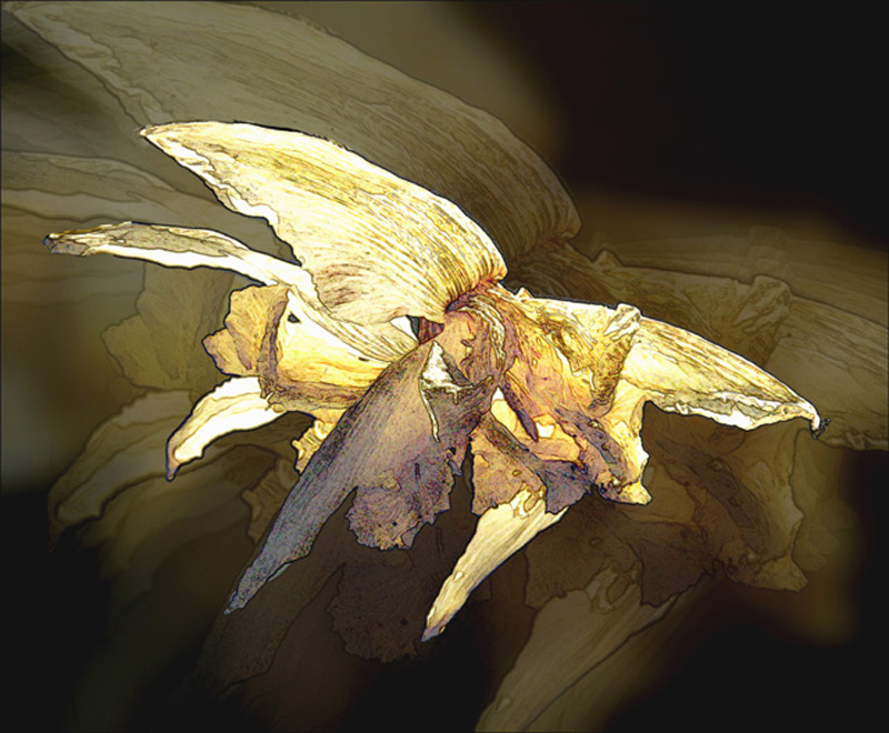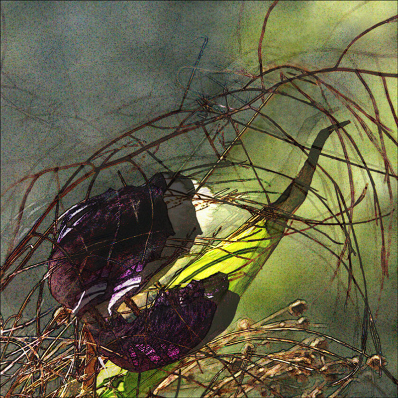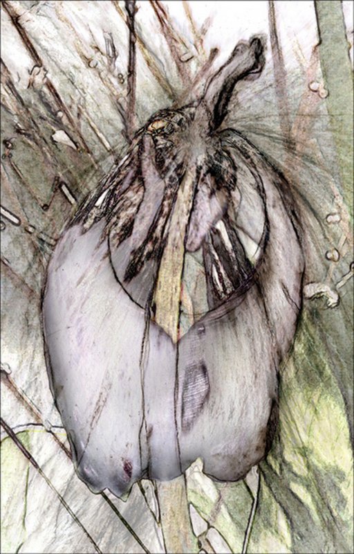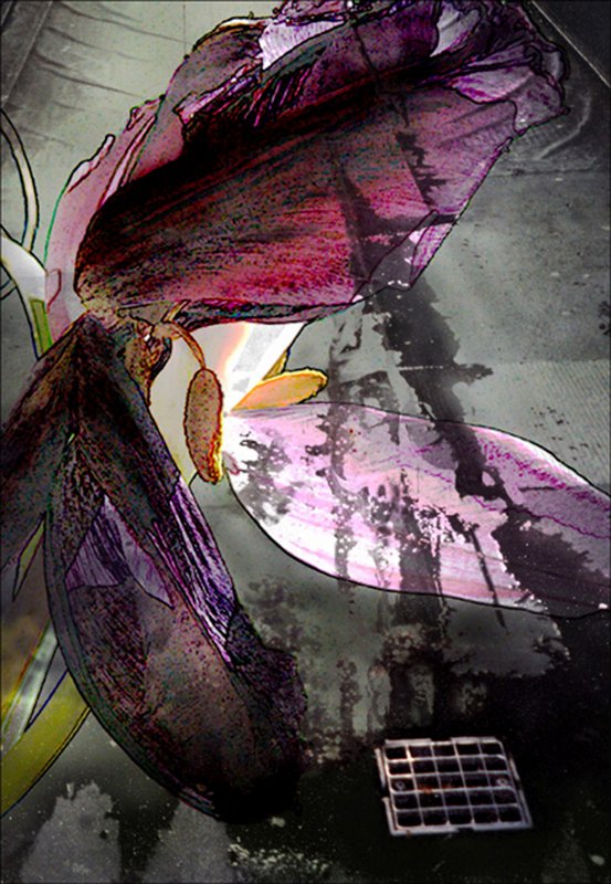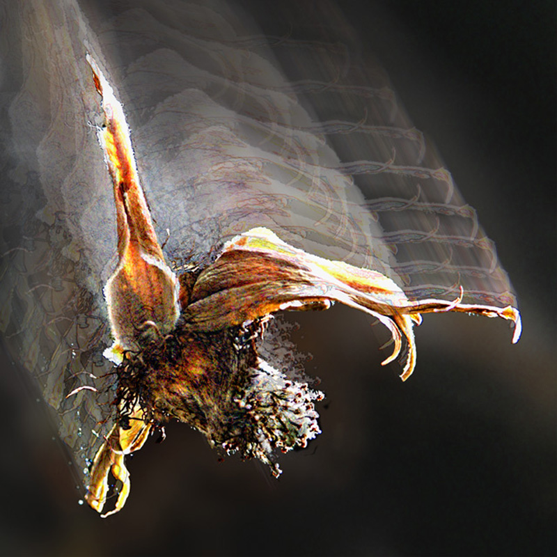 I began to investigate my feelings about life and death by focusing on nature. Beginning with photos of dying flowers, I have used the computer to create richly colored images that celebrate beauty as well as allude to decay and have been transformed into something alive. I thus express both my love of the vibrancy of life as well as its fragility. All images are inkjet prints on Vellum.