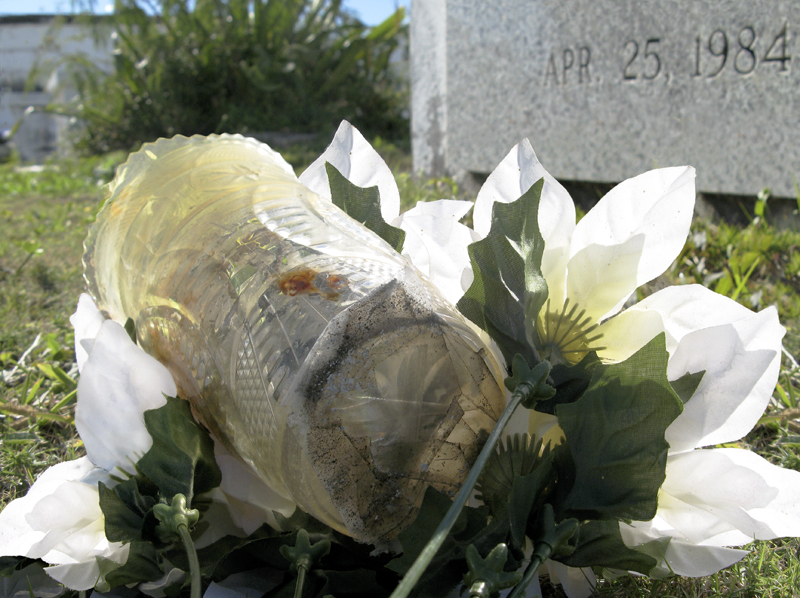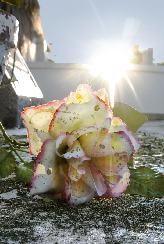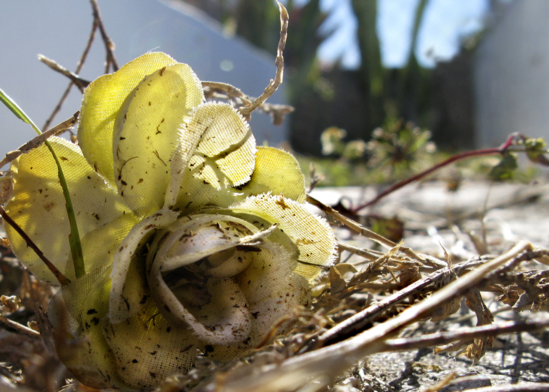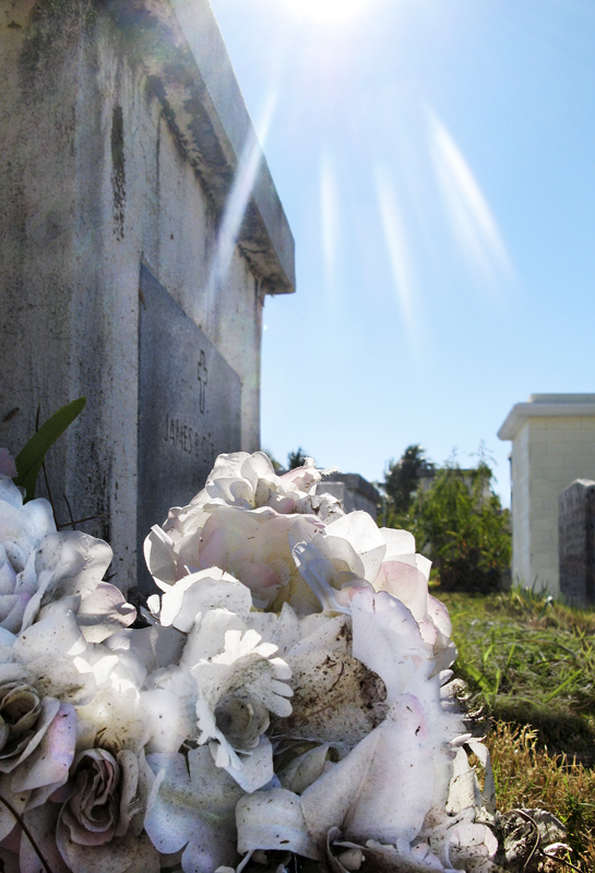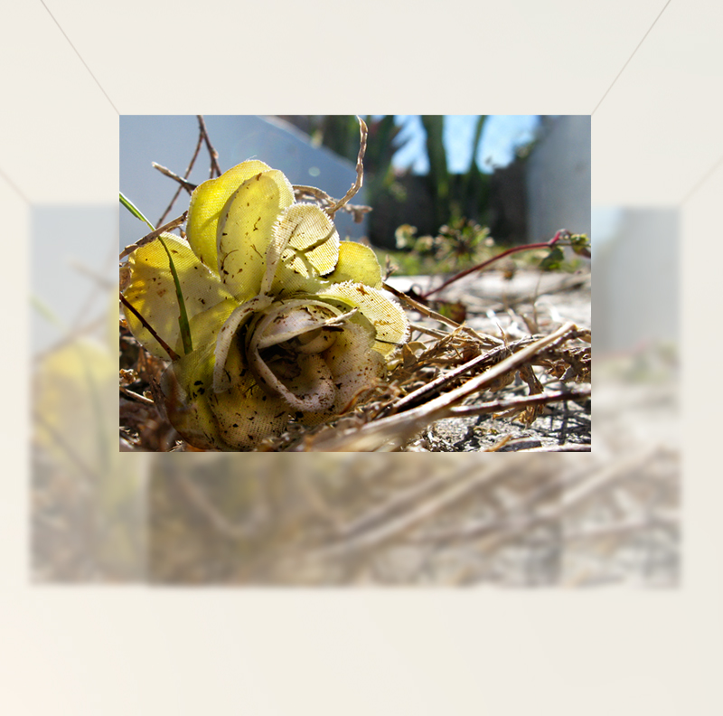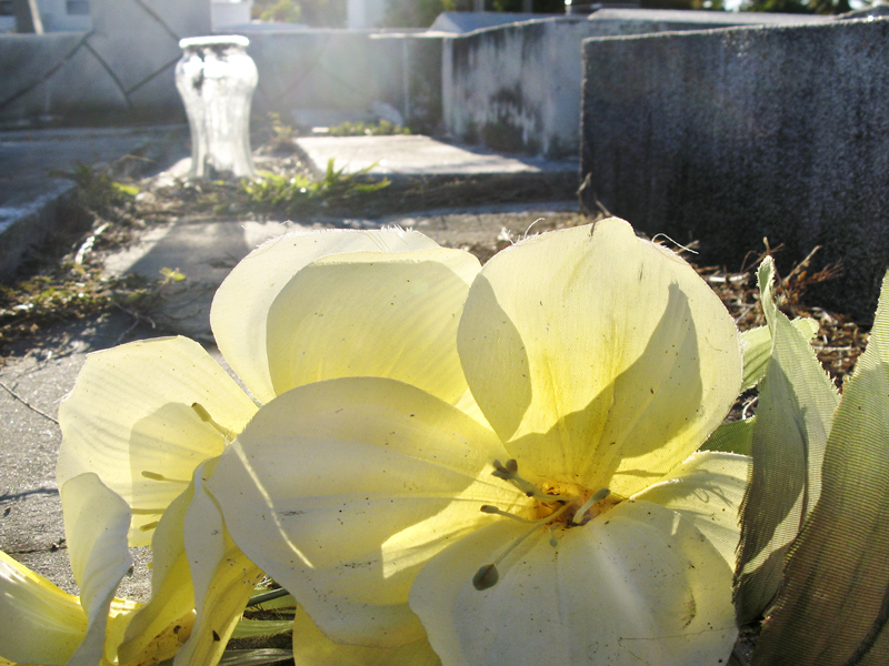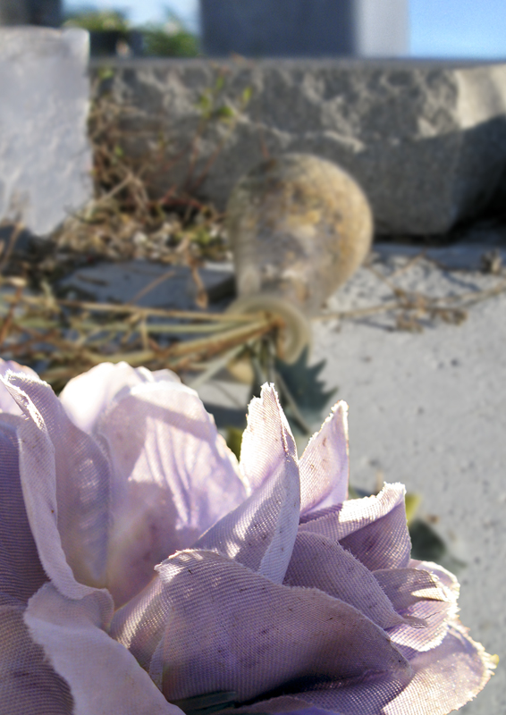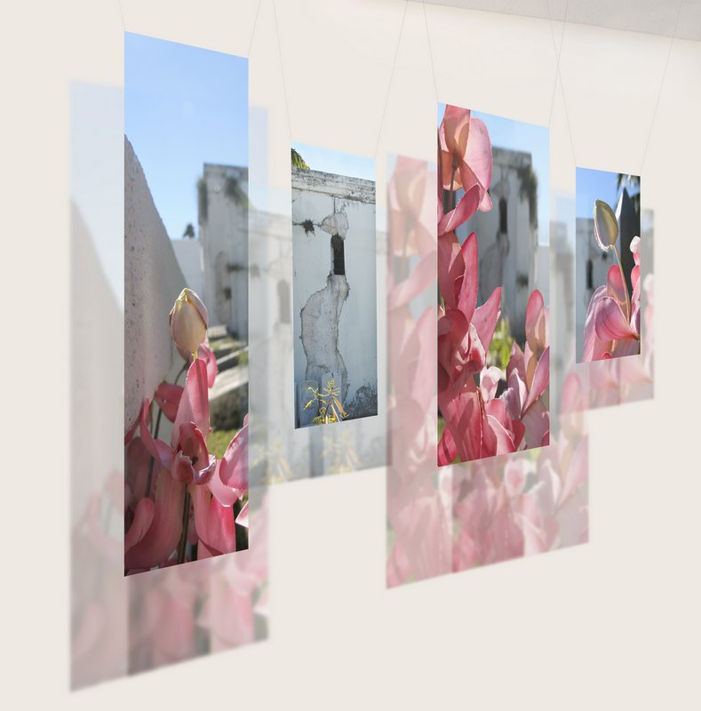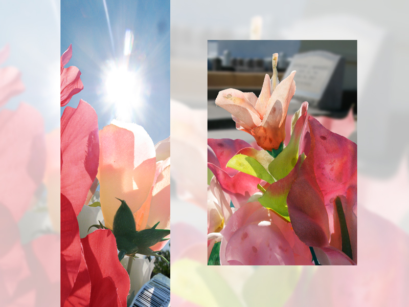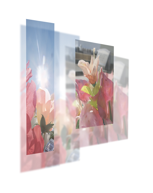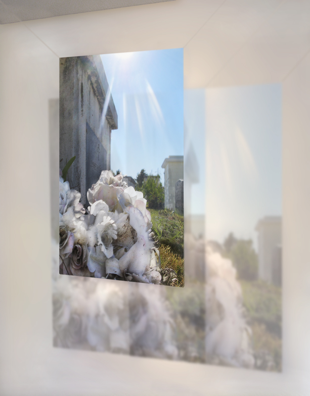 Ephemeral Memorials After taking many photos in a cemetery of decaying, fake flowers juxtaposed against monuments, I began to question myself. I don’t believe in cemeteries and had found myself repulsed but drawn to this barren place. In my studio, printed on transparent film and suspended away from the wall, the lighting causes overlapping shadows and the images and their shadows move with the air. They have been transformed into something ephemeral, affecting me in a way that I don't fully understand. Why do people remember and then forget their loved ones in cemeteries? Why bring fake flowers as a tribute? I don’t have answers, but there’s something that moves me in these fading, neglected memorials. "Vivian