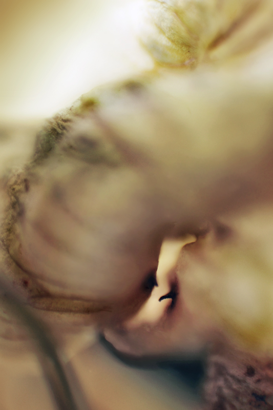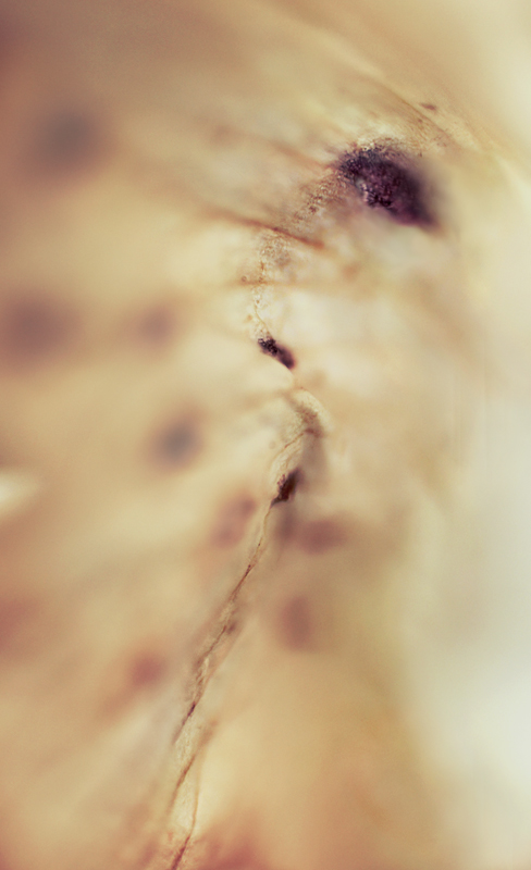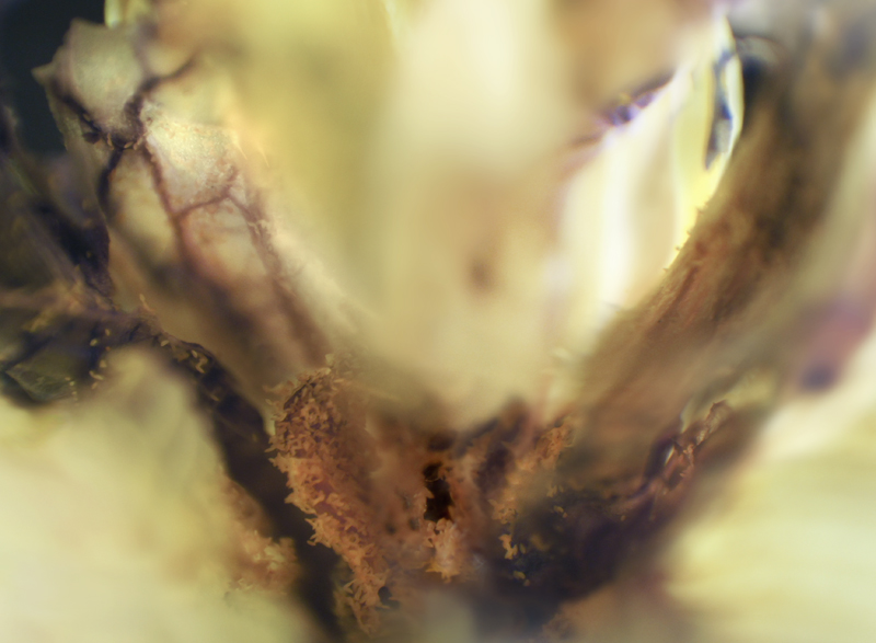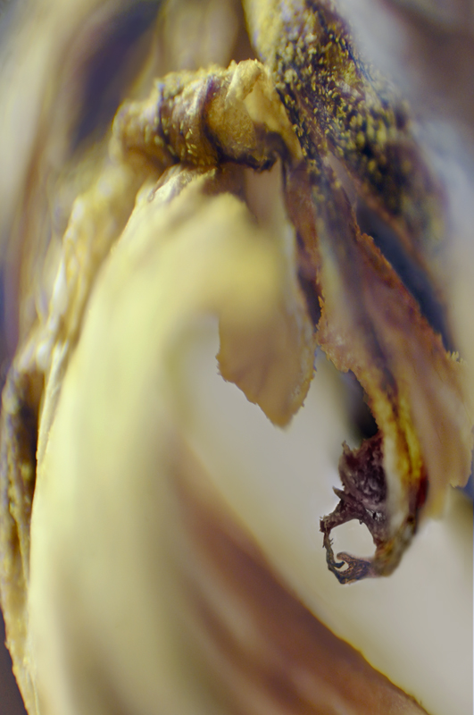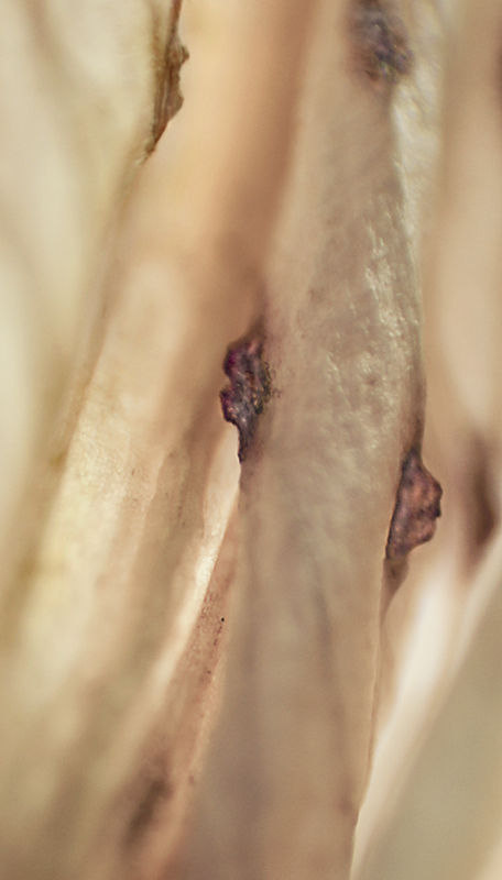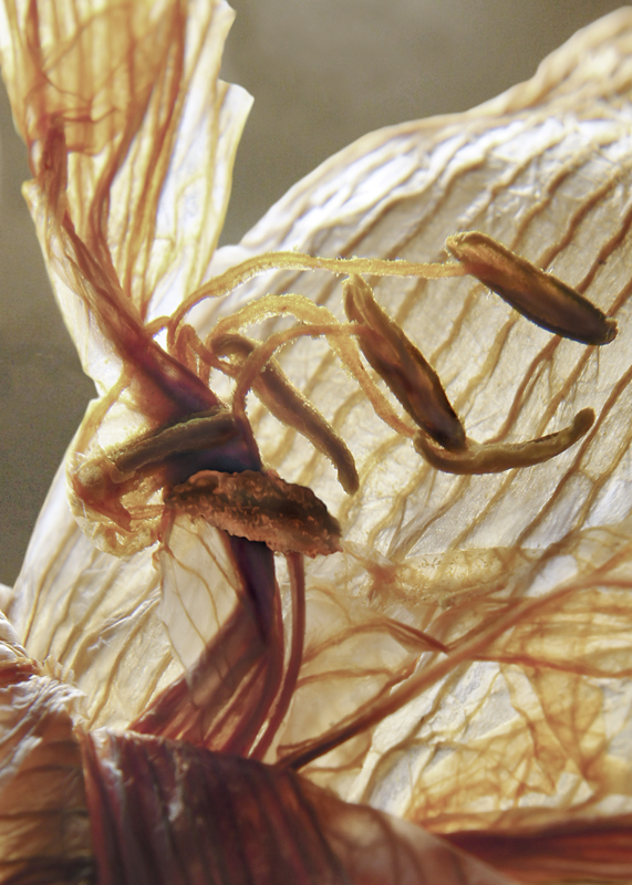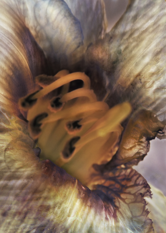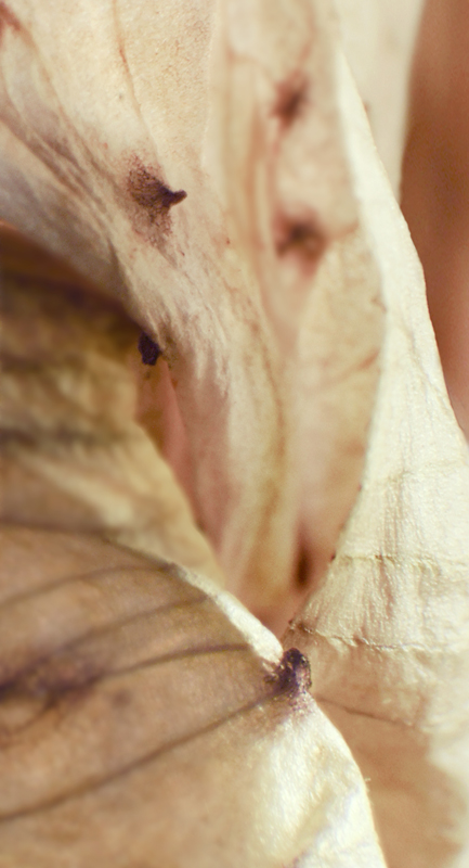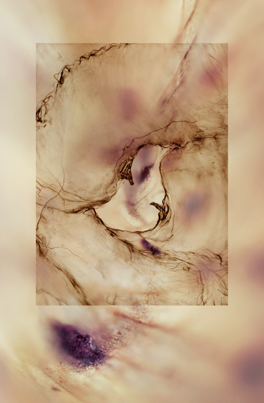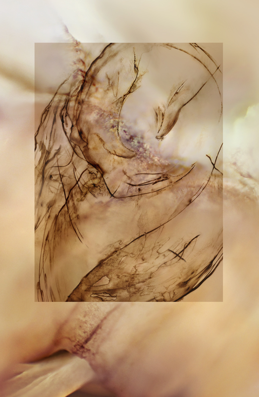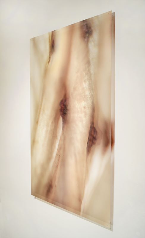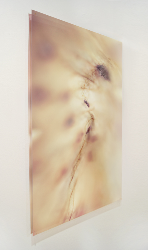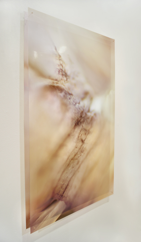 I have been photographing dying flowers for several years and, using the computer, transforming them into something alive. In this series, using an extreme close-up lens on my camera, I was able to capture minute sections of dead flowers. I found imagery that feels like body … inside of body, scarred body. I am amazed at the connection, at this micro level, between plants and humans. I print the same image on paper and transparent film and pin the film over the paper, creating an out-of-focus, three-dimensional effect.