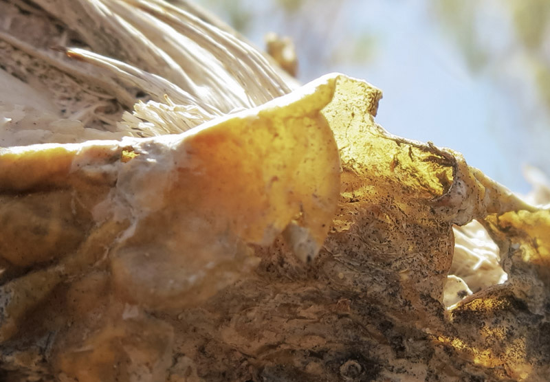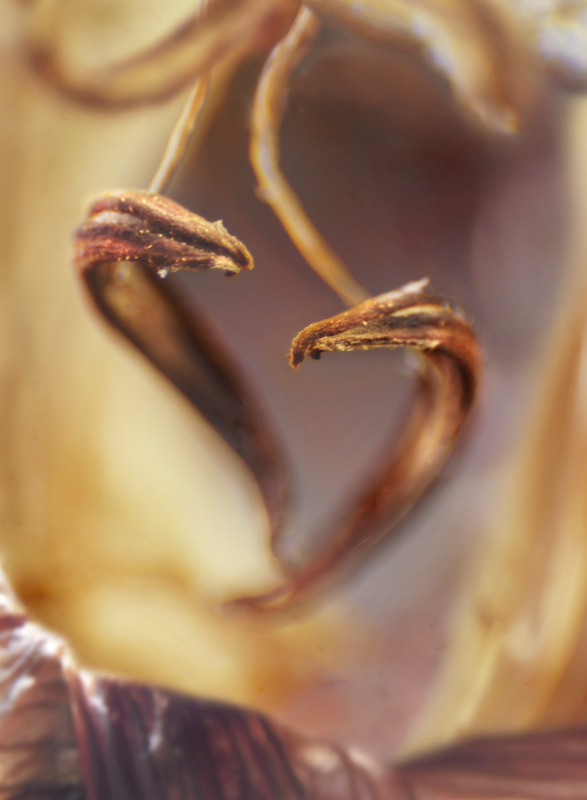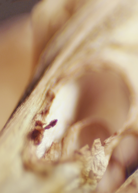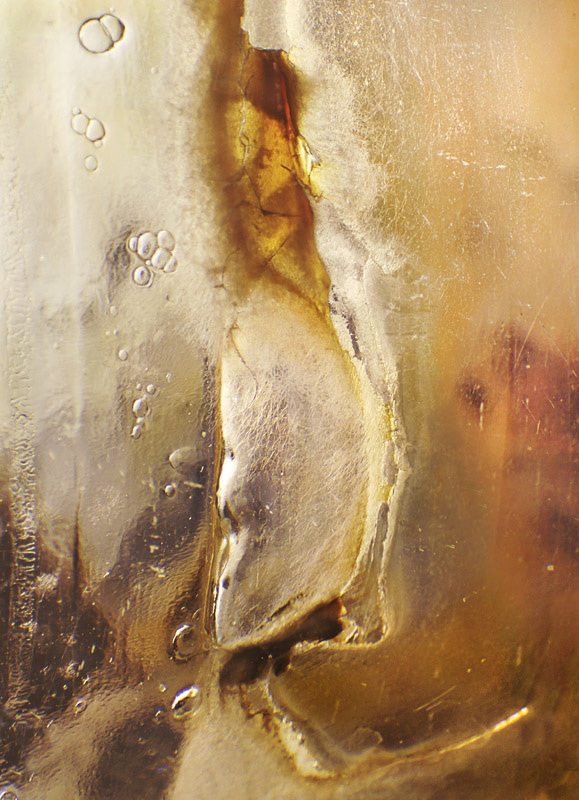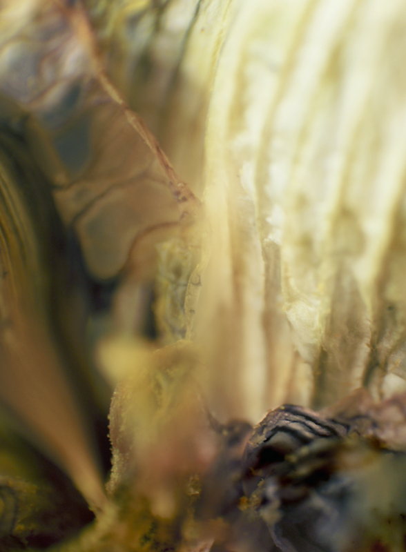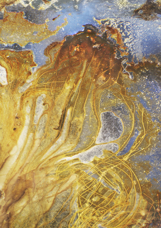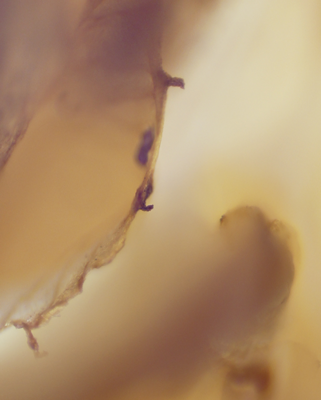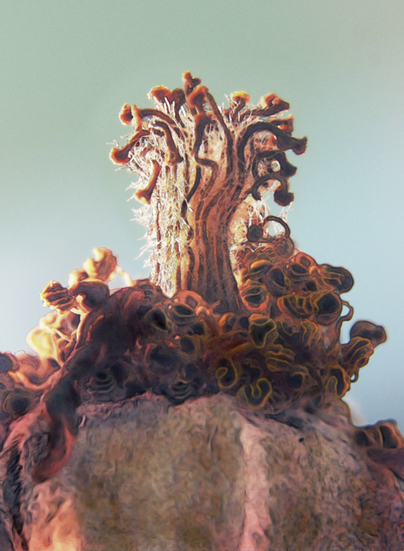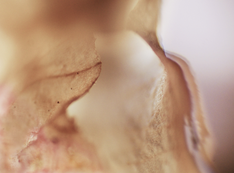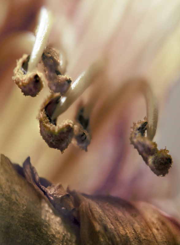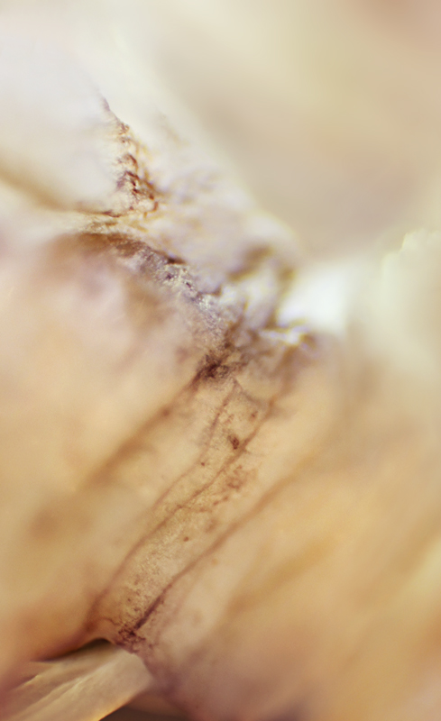 I have been photographing dying flowers for several years and, using the computer, transforming them into something alive. In this series, using an extreme close-up lens on my camera, I was able to capture minute sections of dead flowers. I found imagery that feels like body … inside of body, scarred body. I am amazed at the connection, at this micro level, between plants and humans. I print the same image on paper and transparent film and pin the film over the paper, creating an out-of-focus, three-dimensional effect.