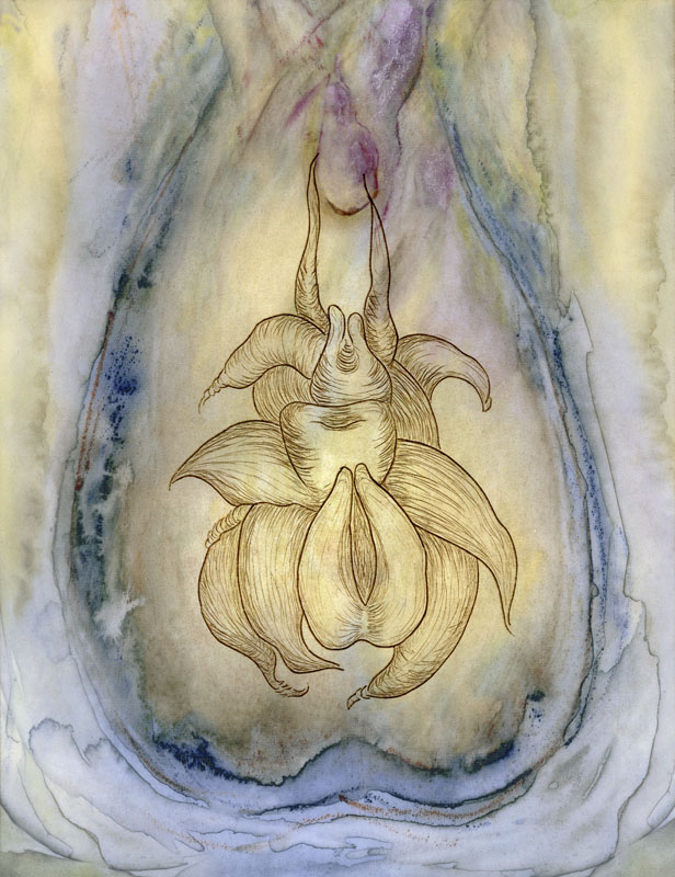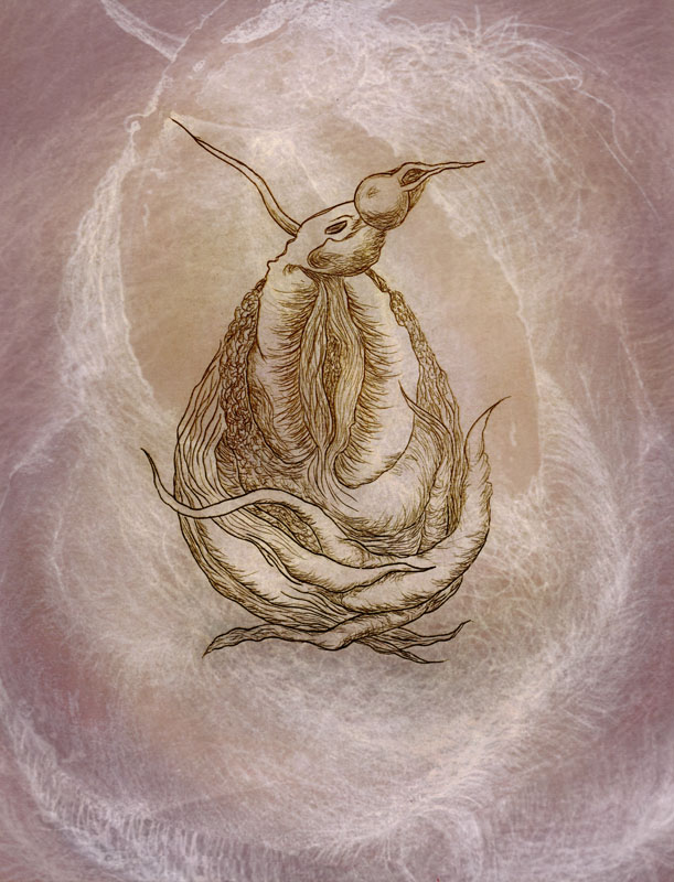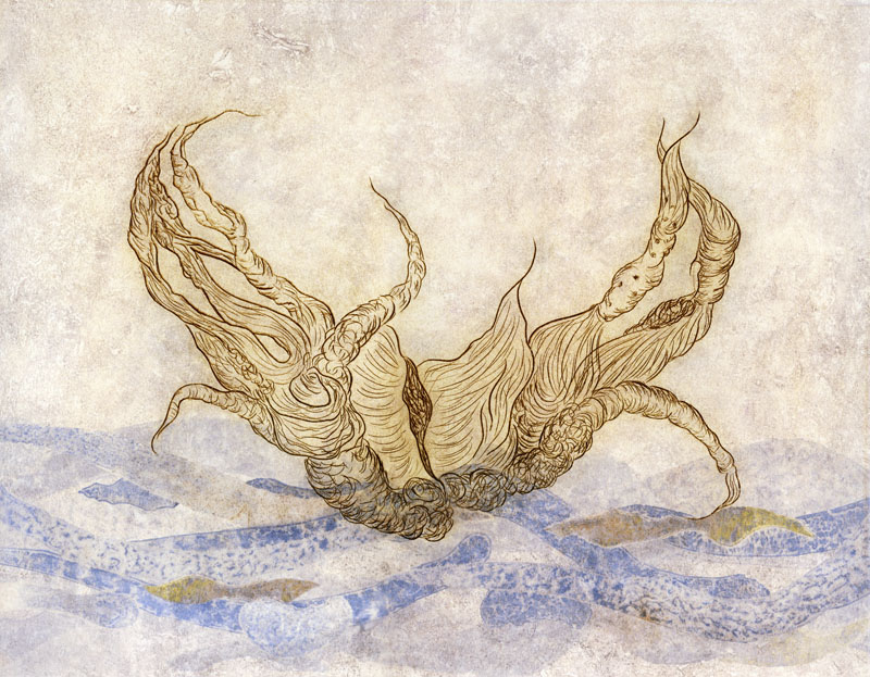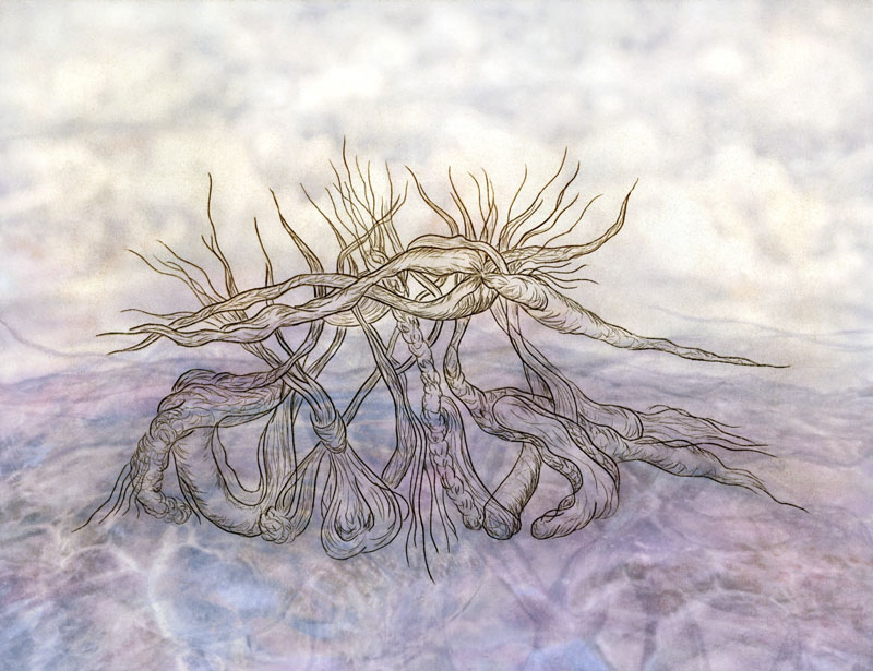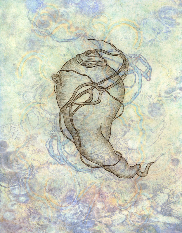 I have been drawing from my imagination for many years. Most of the imagery comes from my love of plants and I often use actual organic material as inspiration. I recently decided to develop these drawings into a series of drypoints but became intrigued with creating imagery that played against the drawings. Using Photoshop, I modified images that were scanned from a monoprint, watercolor, drawing or photograph, often combining several images, until I was inspired by the play of the image against the original drawing. For the final image, I combined printing processes, printing the drypoint on the press over the background inkjet print.