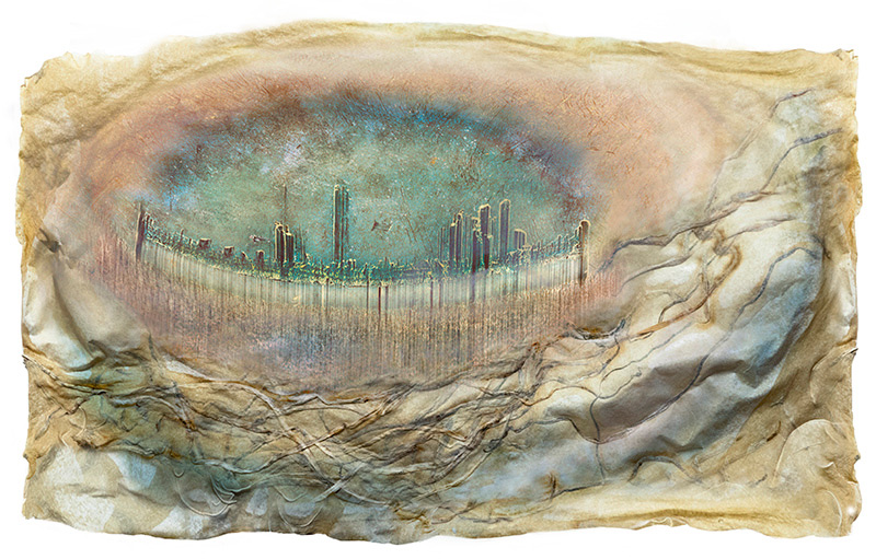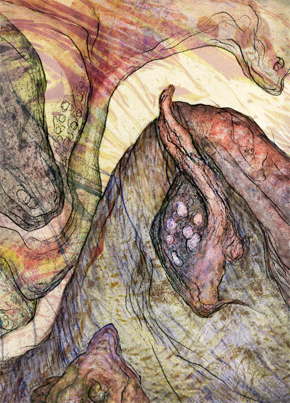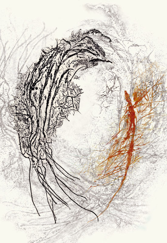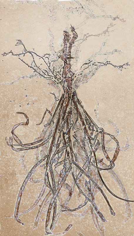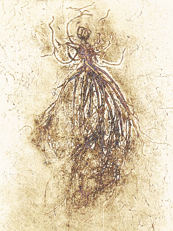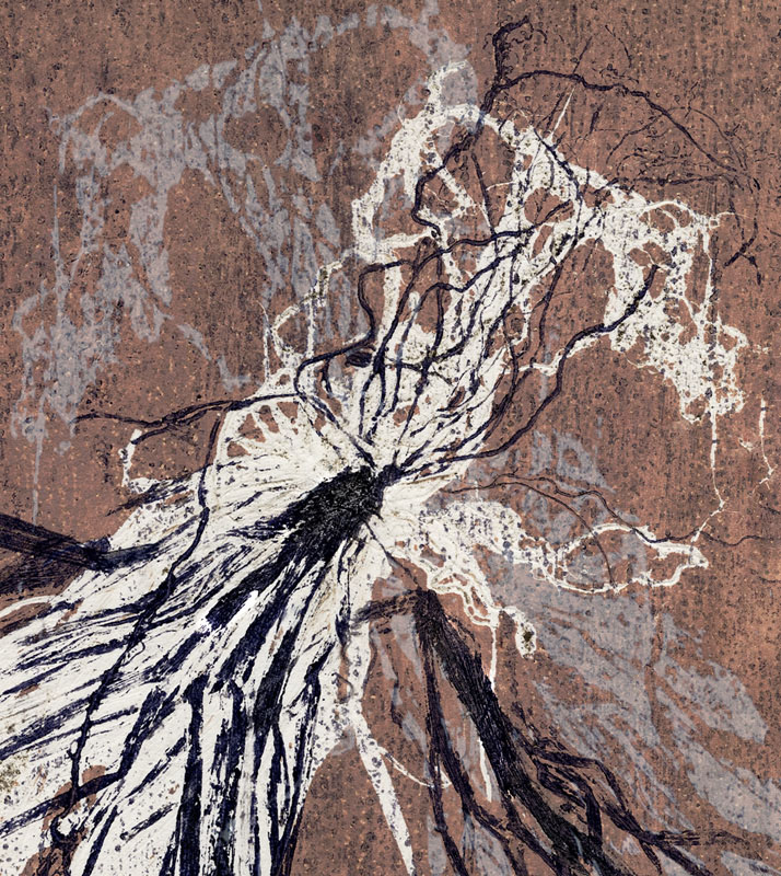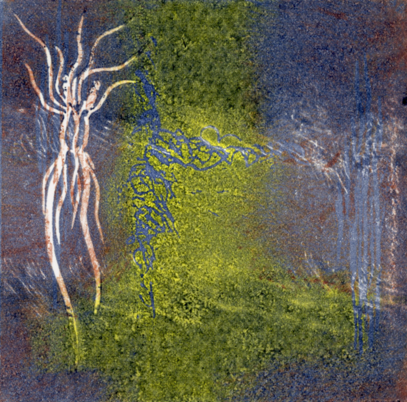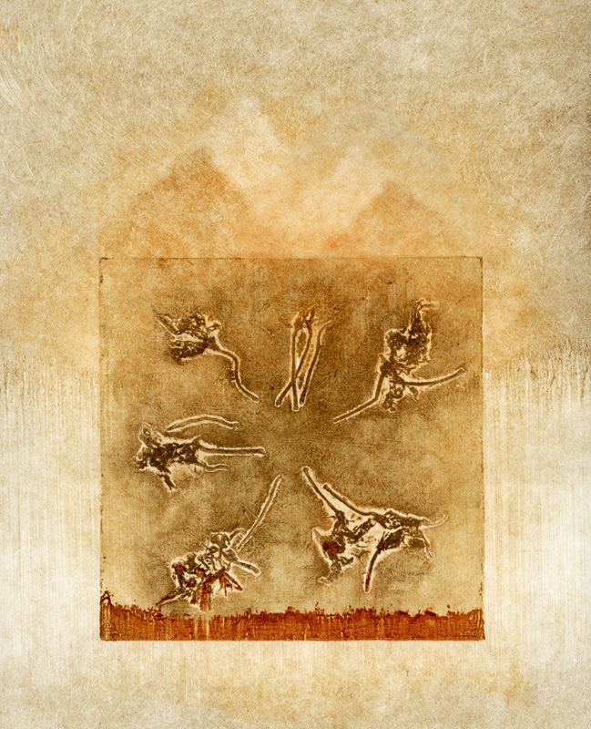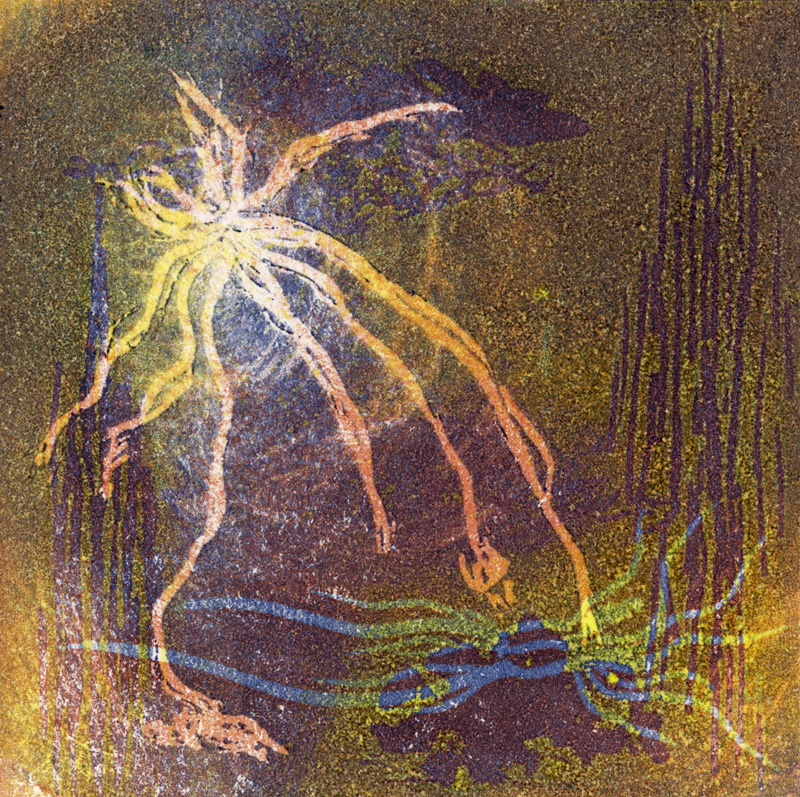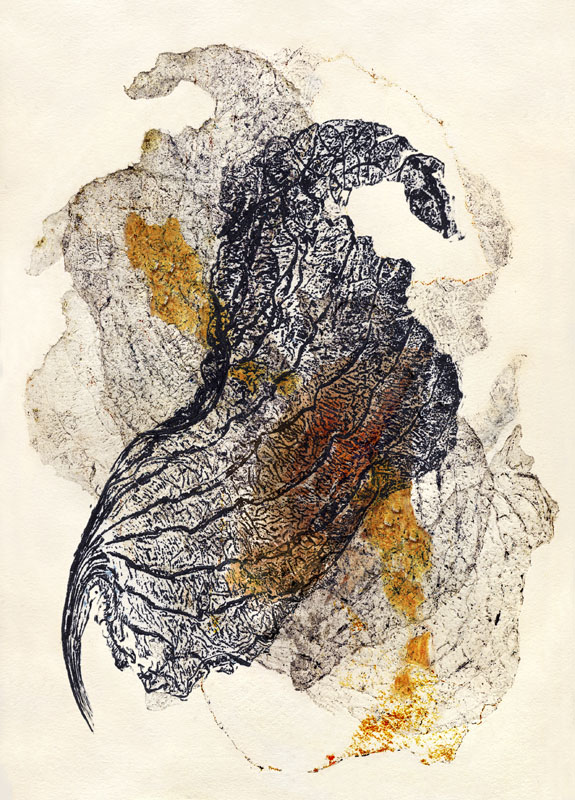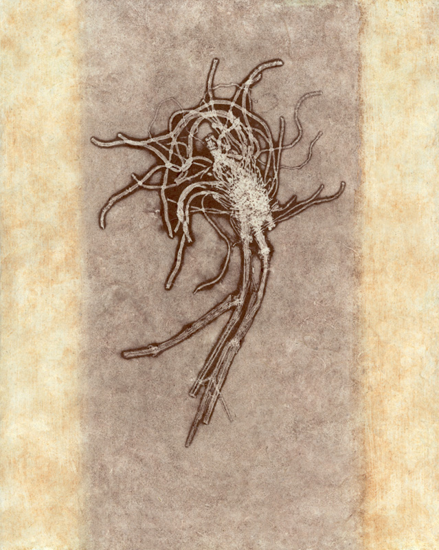 I've been experimenting with various types of printmaking for several years and love the element of surprise as the print comes off the press. As with my other works, I am drawn to organic imagery. I often use actual plant material to make a collagraph or, when creating a monoprint, press a plant to the plate to make an impression. I combine techniques, using monoprint to modify a collagraph, and usually bring the image to the computer for further modifications.