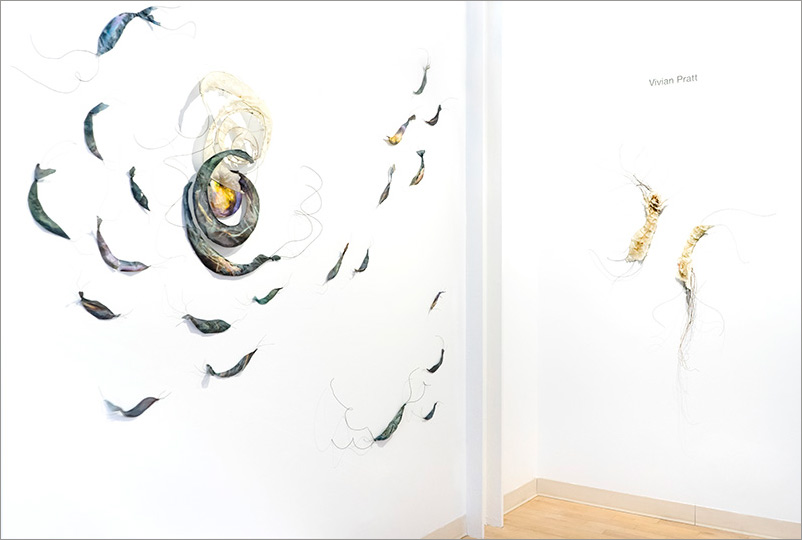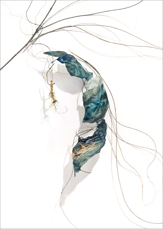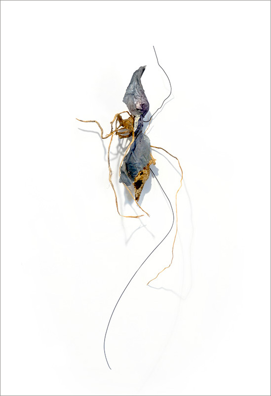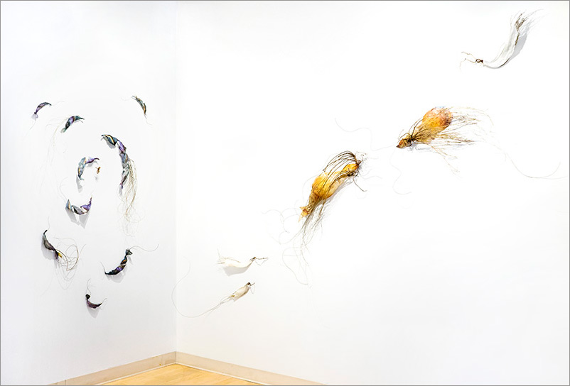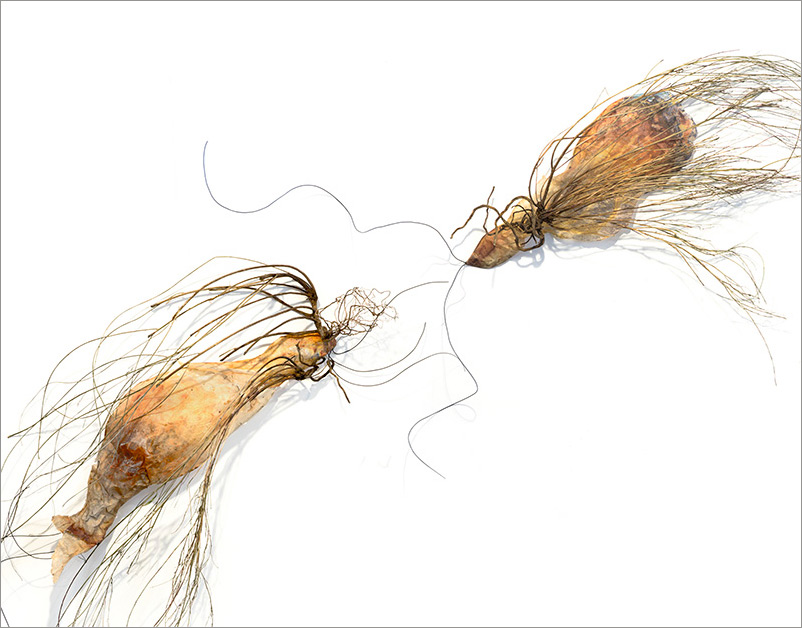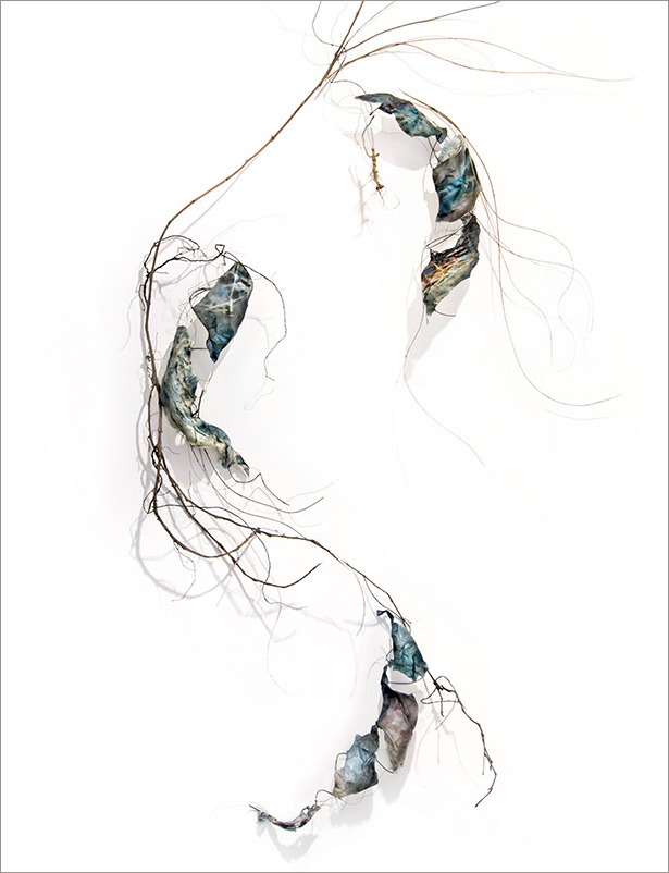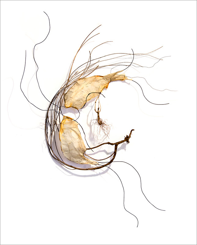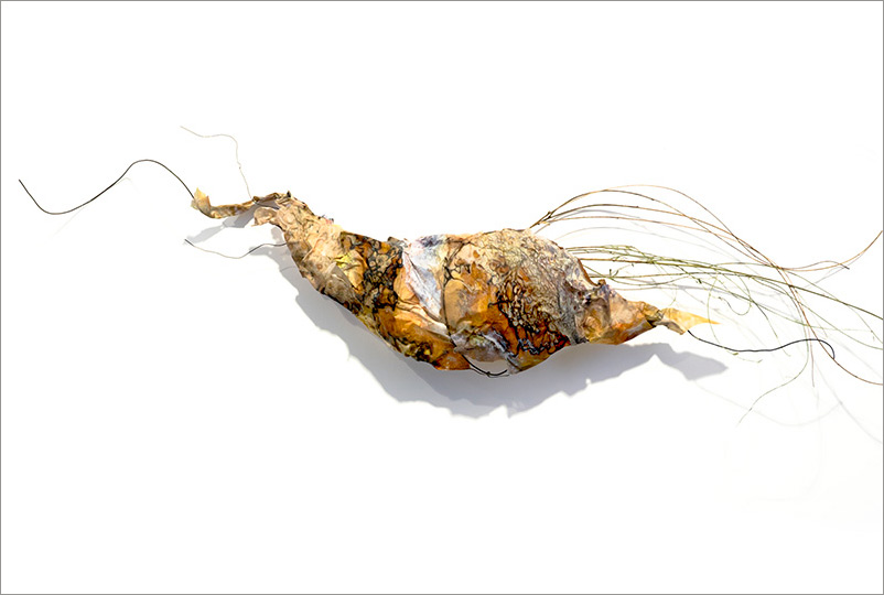 This series began by molding paper over wire armatures to create sculptural reliefs. I start intuitively with no plan, but as they develop they become creature-like, whimsical forms. As I connect them with grasses and vines, they float across the wall, interacting with each other while creating shadows and movement. Chance encounters of imaginary beings.