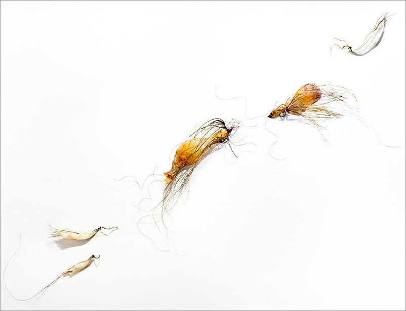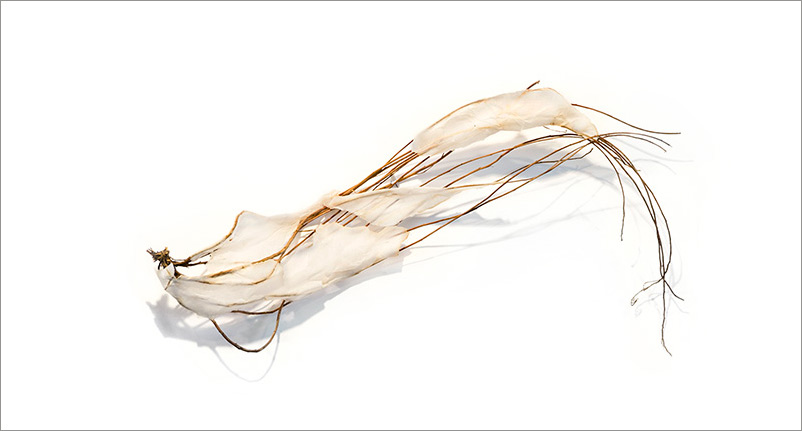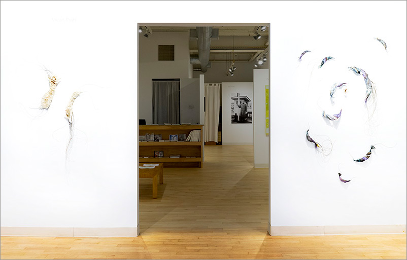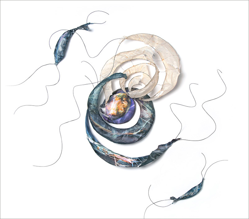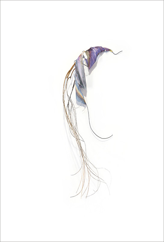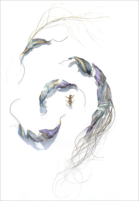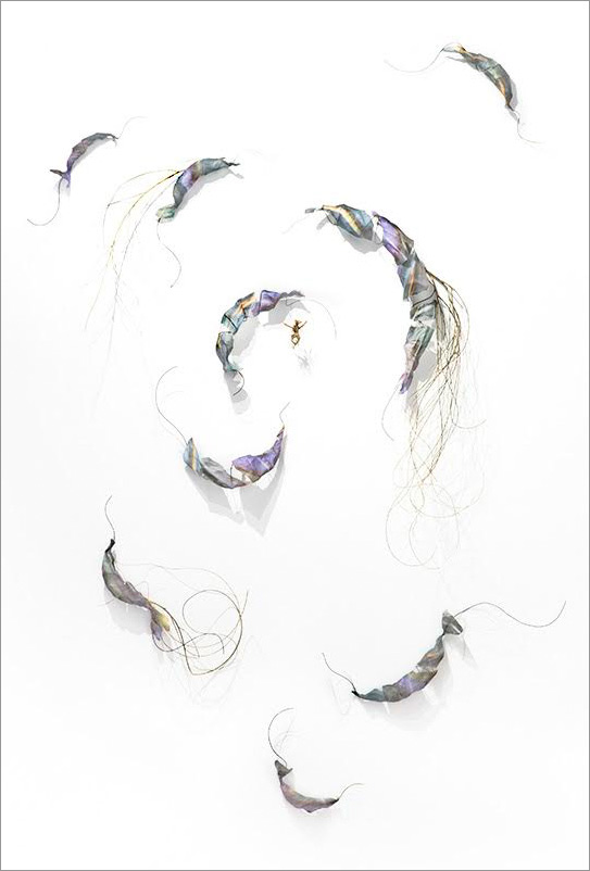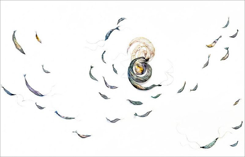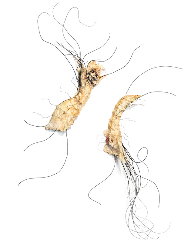 This series began by molding paper over wire armatures to create sculptural reliefs. I start intuitively with no plan, but as they develop they become creature-like, whimsical forms. As I connect them with grasses and vines, they float across the wall, interacting with each other while creating shadows and movement. Chance encounters of imaginary beings.