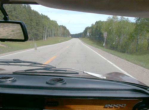 of trees with plenty of bugs going splat on the windshield.
