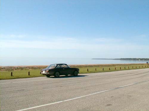 The Warrior (we're talking about the car) takes a breather alongside the blue water